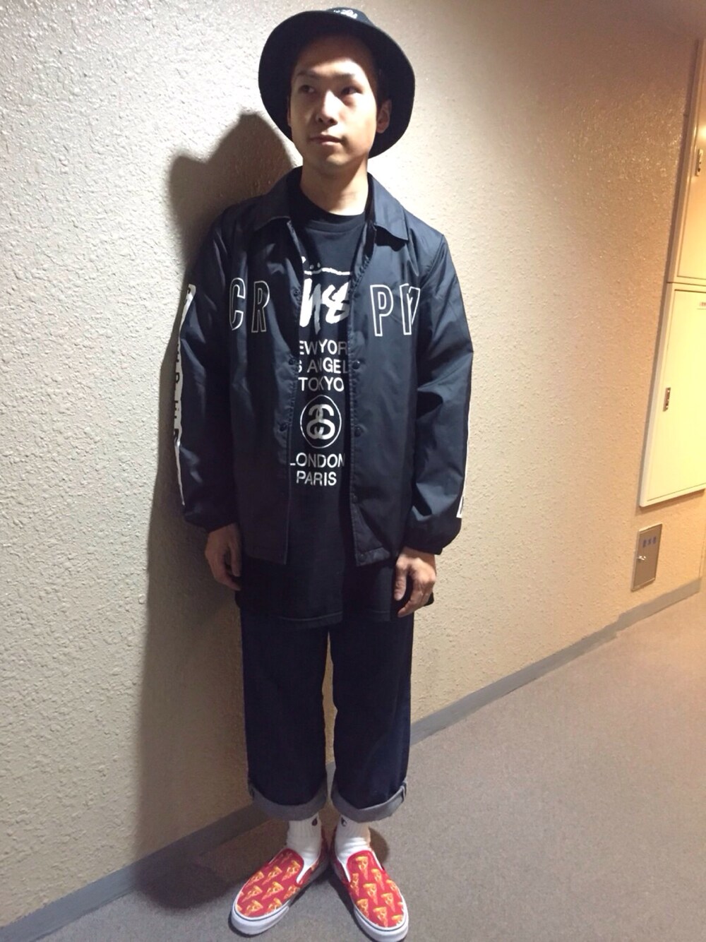 ストリートコーデ!! 最近買ったピザ柄のVANSとゆる〜いWEGOのデニムはマストアイテムになってる。 STUSSYのTシャツとバケットハットも合わせてみました。