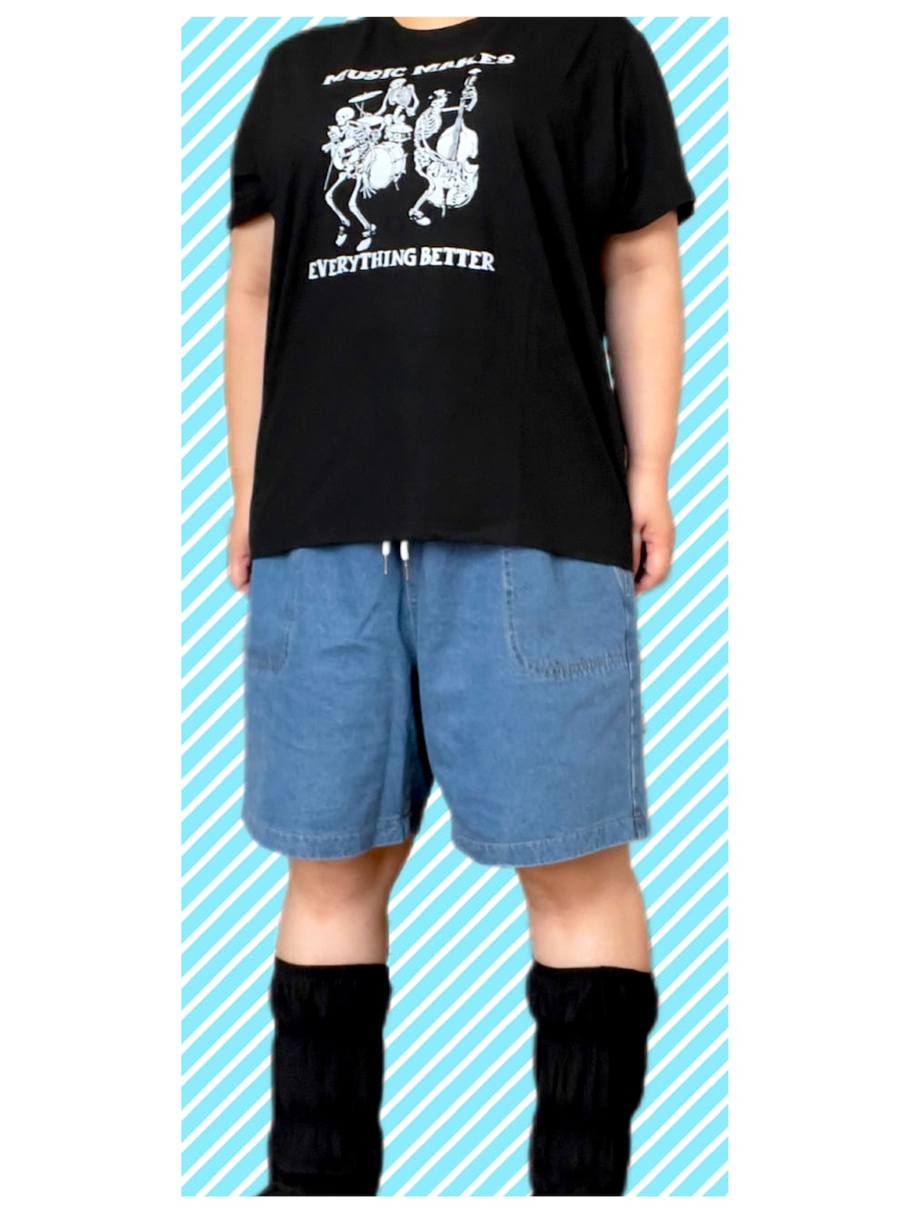 ブラック系のTシャツ/カットソー、ブルー系のデニムパンツ、ブラック系のレッグウォーマーを着用したレディースの夏コーディネートの1枚目の写真