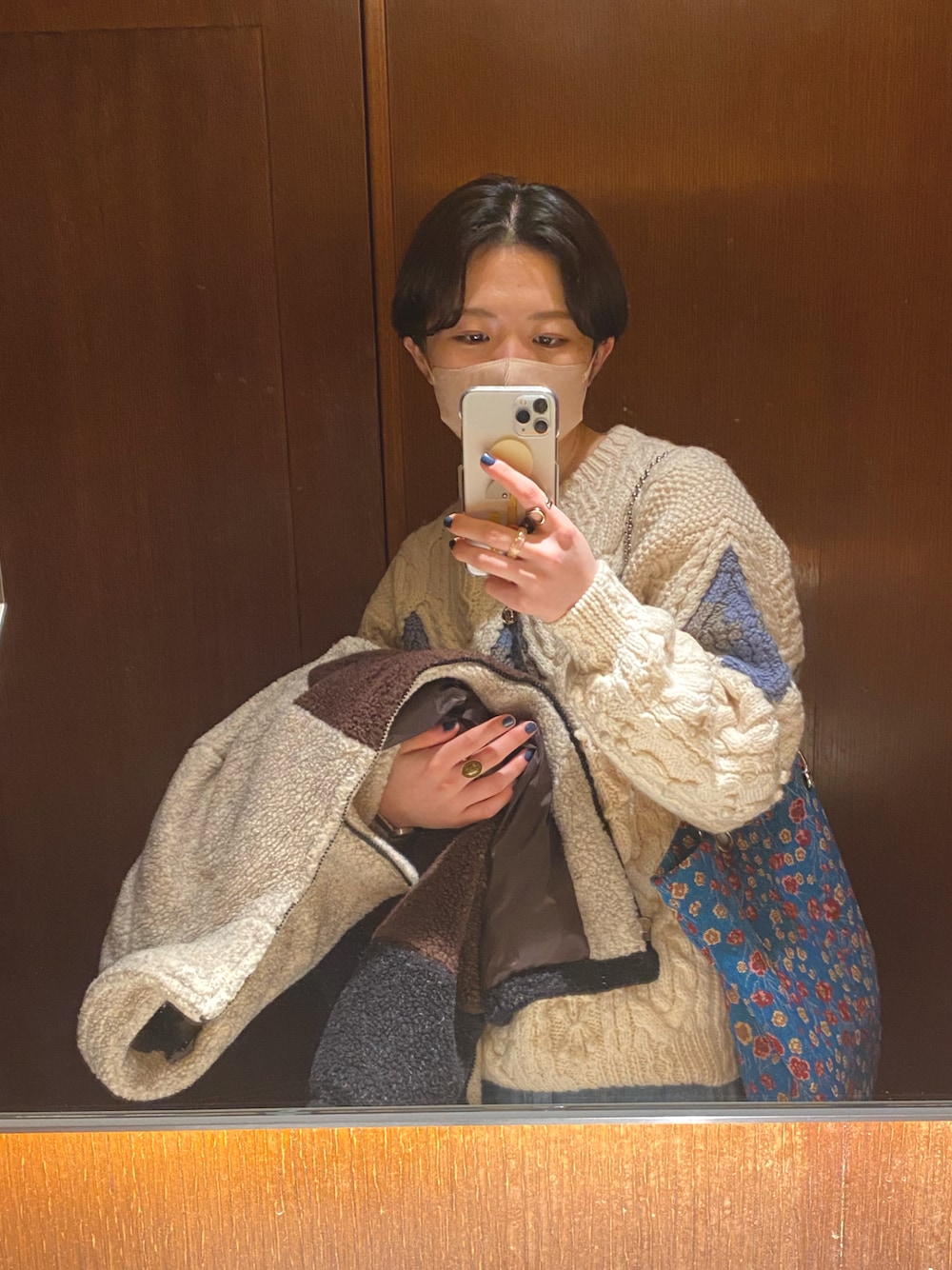 セーターの下はデニムのパンツ ネイルとリングもバックと同じカラーに合わせて気分上がります
