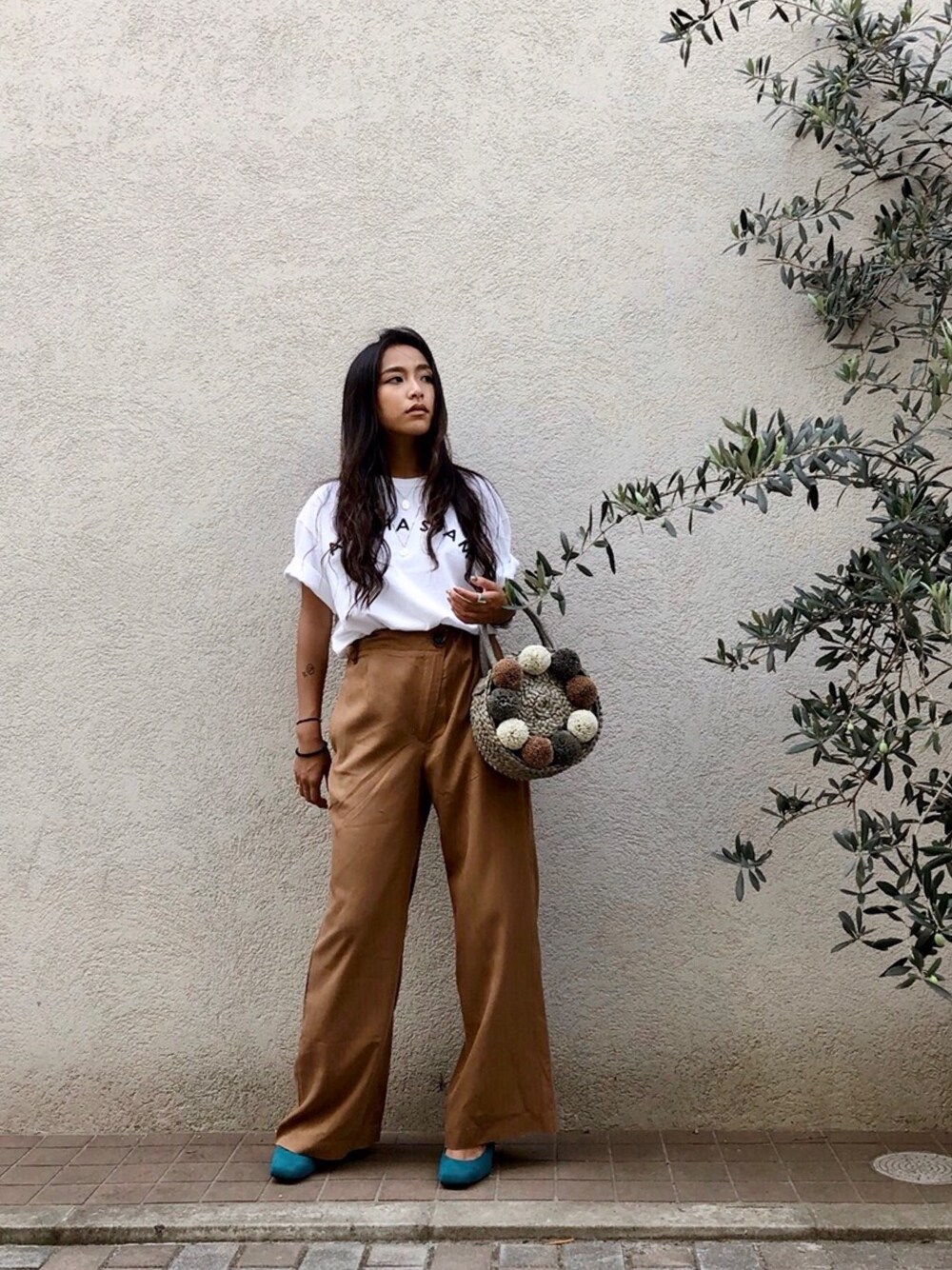 ALEXIA STAM(FLAGSHIP STORE OMOTESANDO)のかごバッグ「Pom Pom Round Straw Bag/カゴバッグ」を使ったコーディネート