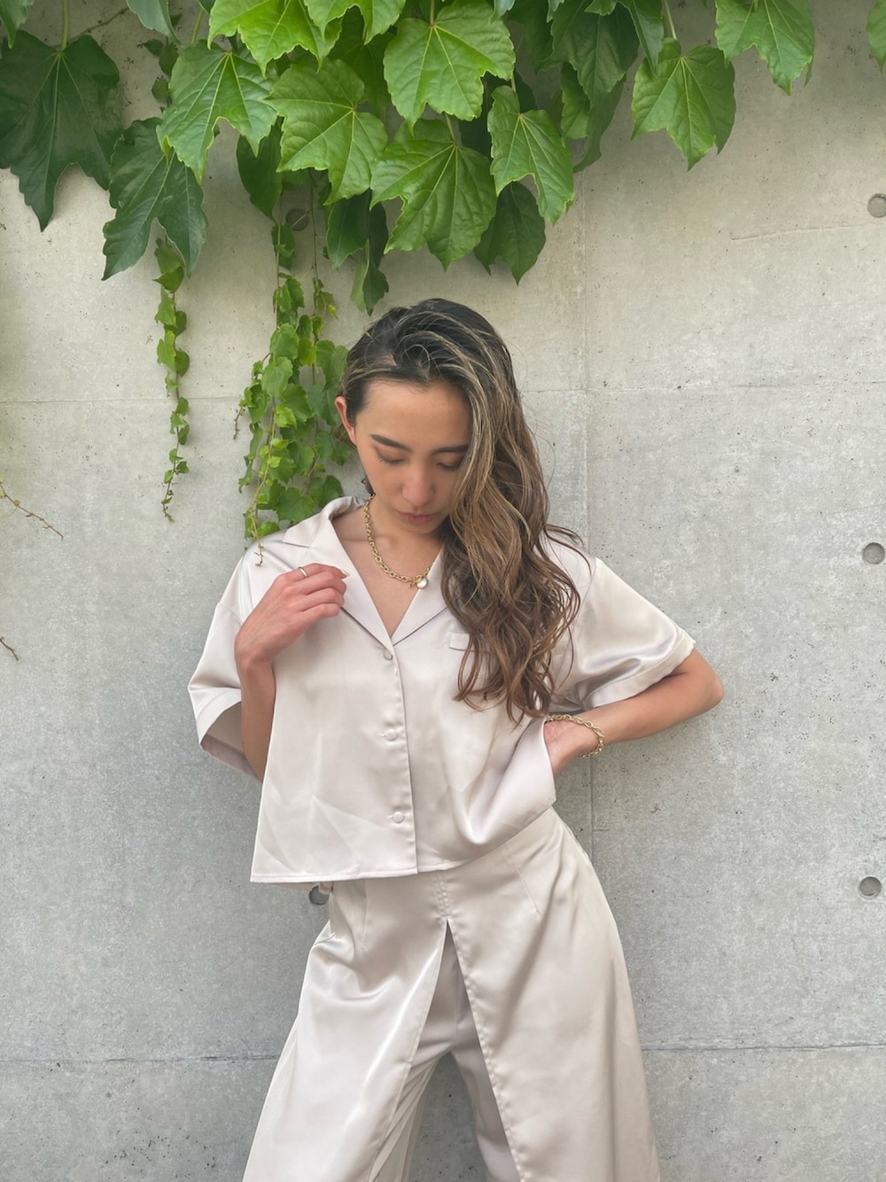 ALEXIA STAM(FLAGSHIP STORE OMOTESANDO)のシャツ/ブラウス「Satin Open Collar Shirt/サテンオープンカラーシャツ」を使ったコーディネート
