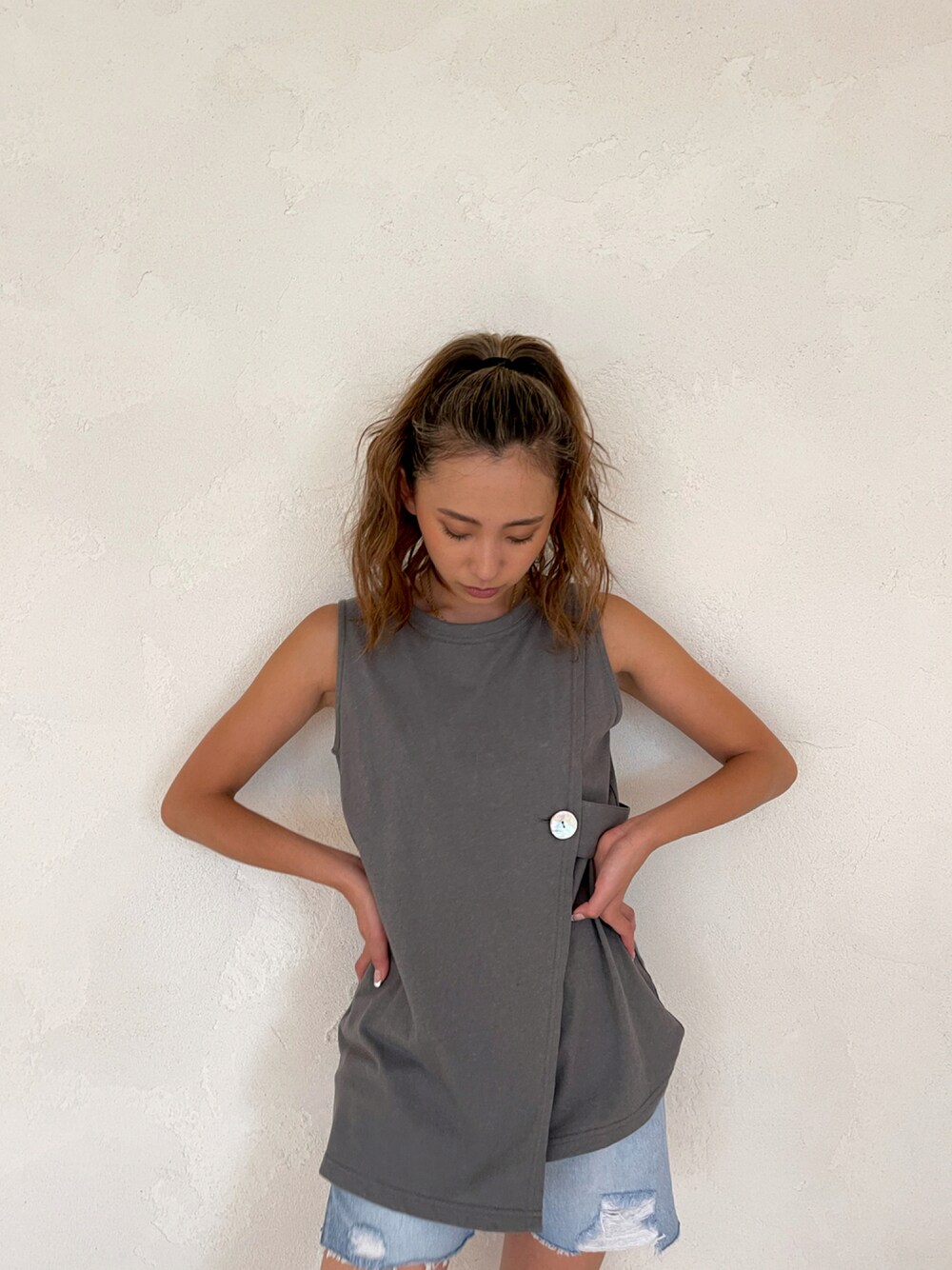 ALEXIA STAM(FLAGSHIP STORE OMOTESANDO)のTシャツ/カットソー「Side Button Sleeveless Wrap Top/サイドボタンスリーブレスラップトップ」を使ったコーディネート