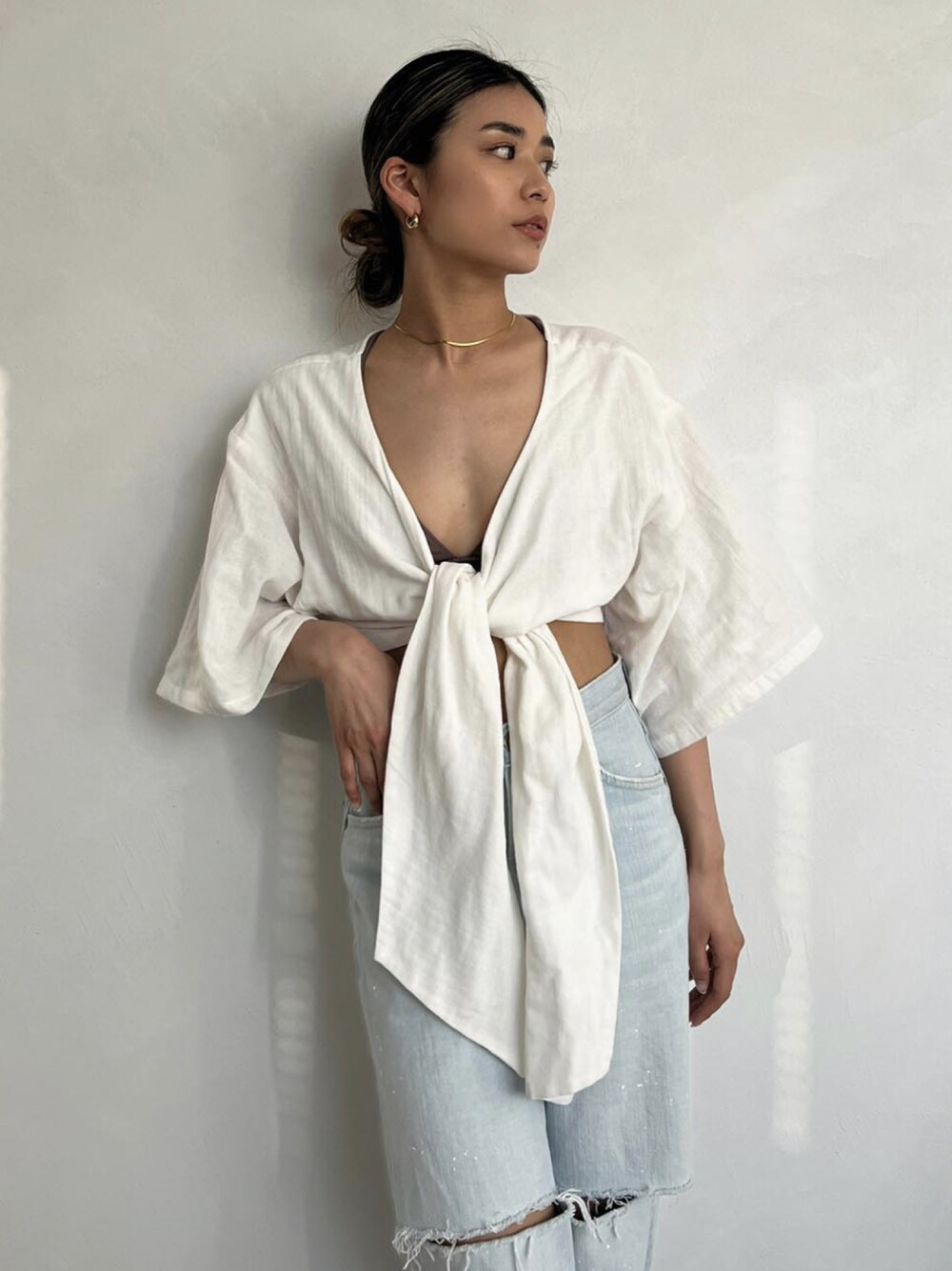ALEXIA STAM(FLAGSHIP STORE OMOTESANDO)のシャツ/ブラウス「Tie Front Gauze Top / クロップド丈ガーゼトップス」を使ったコーディネート