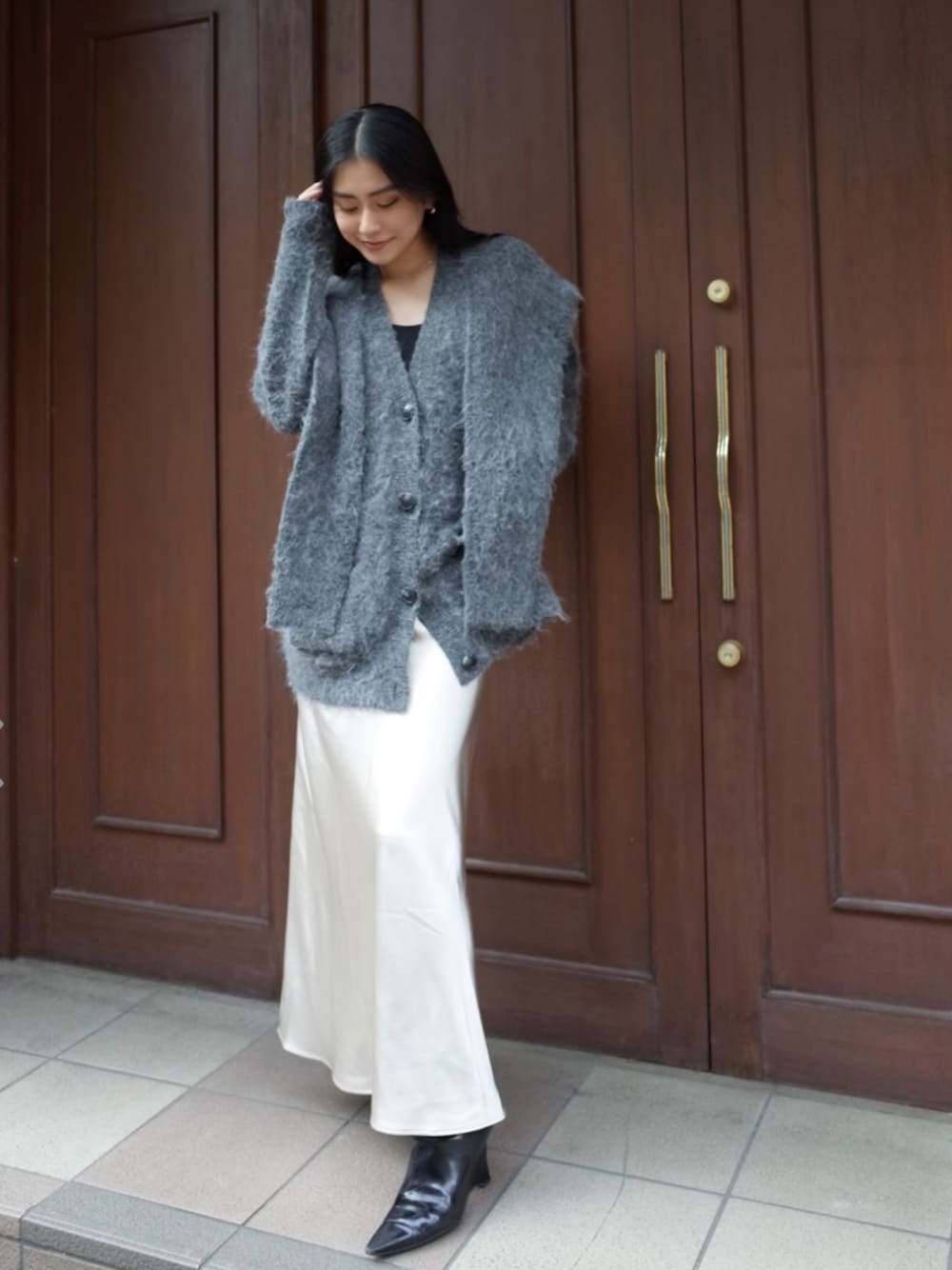 ALEXIA STAM(FLAGSHIP STORE OMOTESANDO)のカーディガン/ボレロ「Double Sleeve Shaggy Knit Cardigan /ダブルスリーブシャギーカーデ」を使ったコーディネート