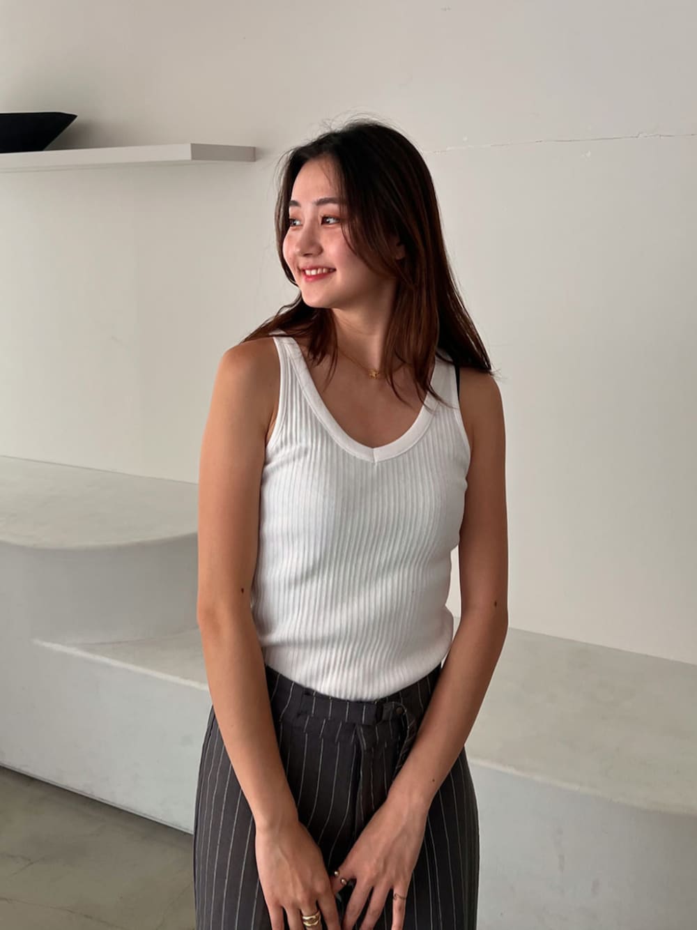 ALEXIA STAM(FLAGSHIP STORE OMOTESANDO)のタンクトップ「Rib V Neck Tank Top /Basic Vネックリブタンク」を使ったコーディネート