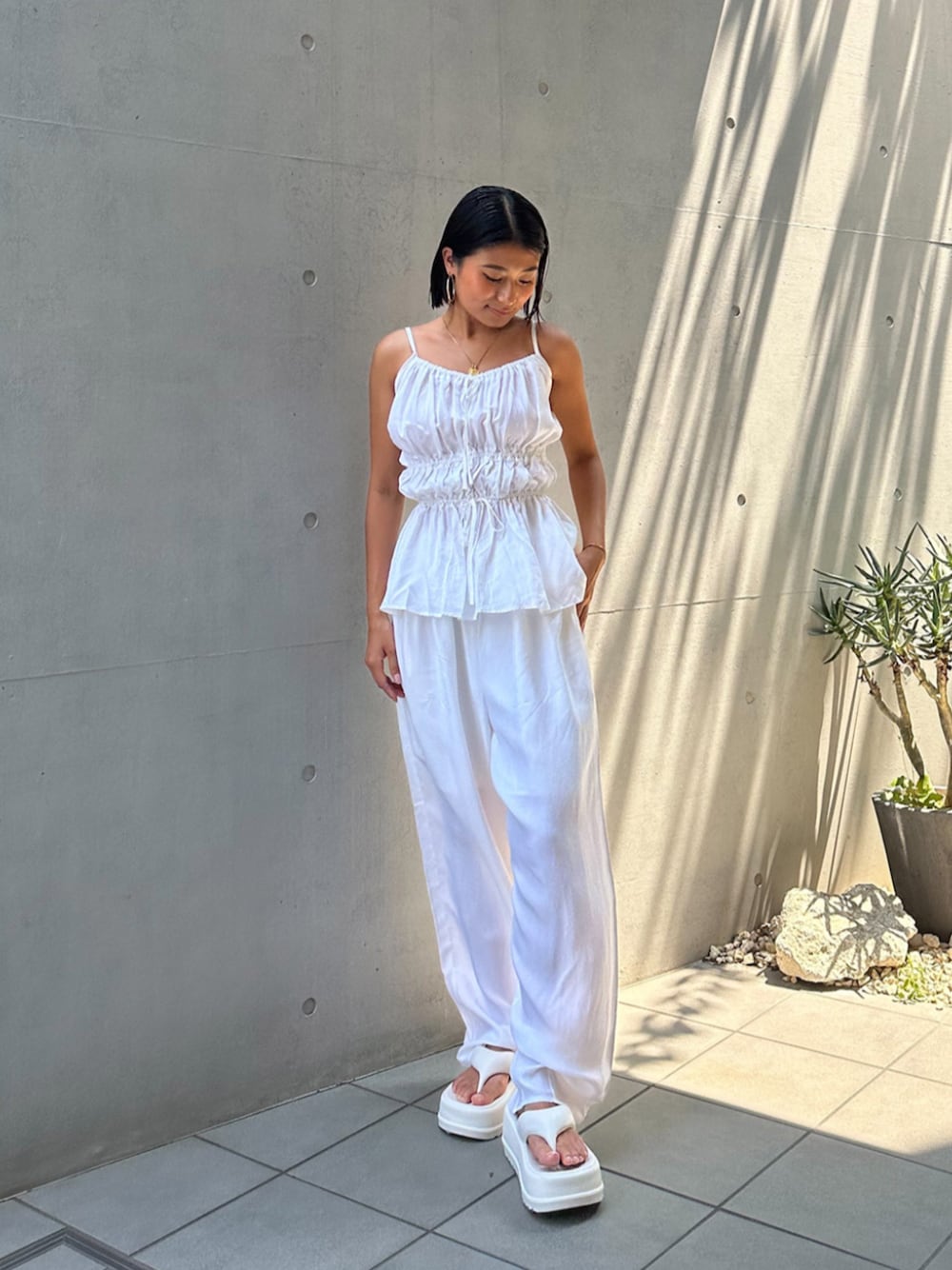 ALEXIA STAM(FLAGSHIP STORE OMOTESANDO)のパンツドレス「Gathered Camisole & Cozy Pants Set /ギャザーキャミ×パンツ 2点Set」を使ったコーディネート