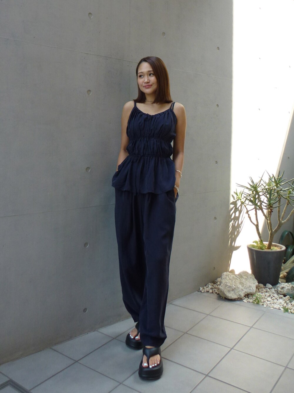 ALEXIA STAM(FLAGSHIP STORE OMOTESANDO)のパンツドレス「Gathered Camisole & Cozy Pants Set /ギャザーキャミ×パンツ 2点Set」を使ったコーディネート