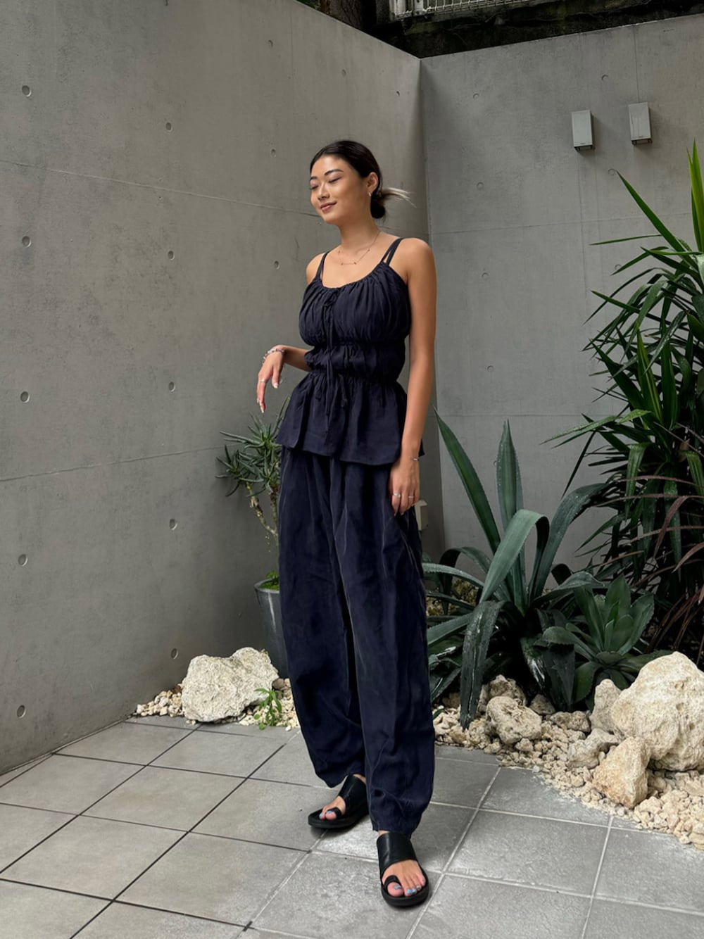 ALEXIA STAM(FLAGSHIP STORE OMOTESANDO)のパンツドレス「Gathered Camisole & Cozy Pants Set /ギャザーキャミ×パンツ 2点Set」を使ったコーディネート