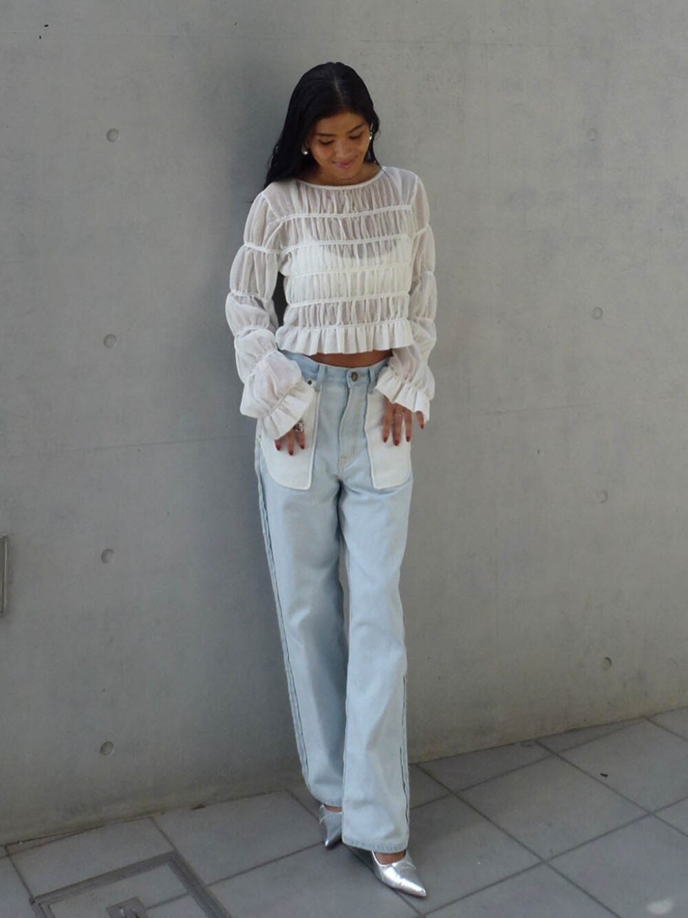 ALEXIA STAM(FLAGSHIP STORE OMOTESANDO)のTシャツ/カットソー「Boat Neck Sheer Cropped Knit Top /シアークロップドトップス」を使ったコーディネート