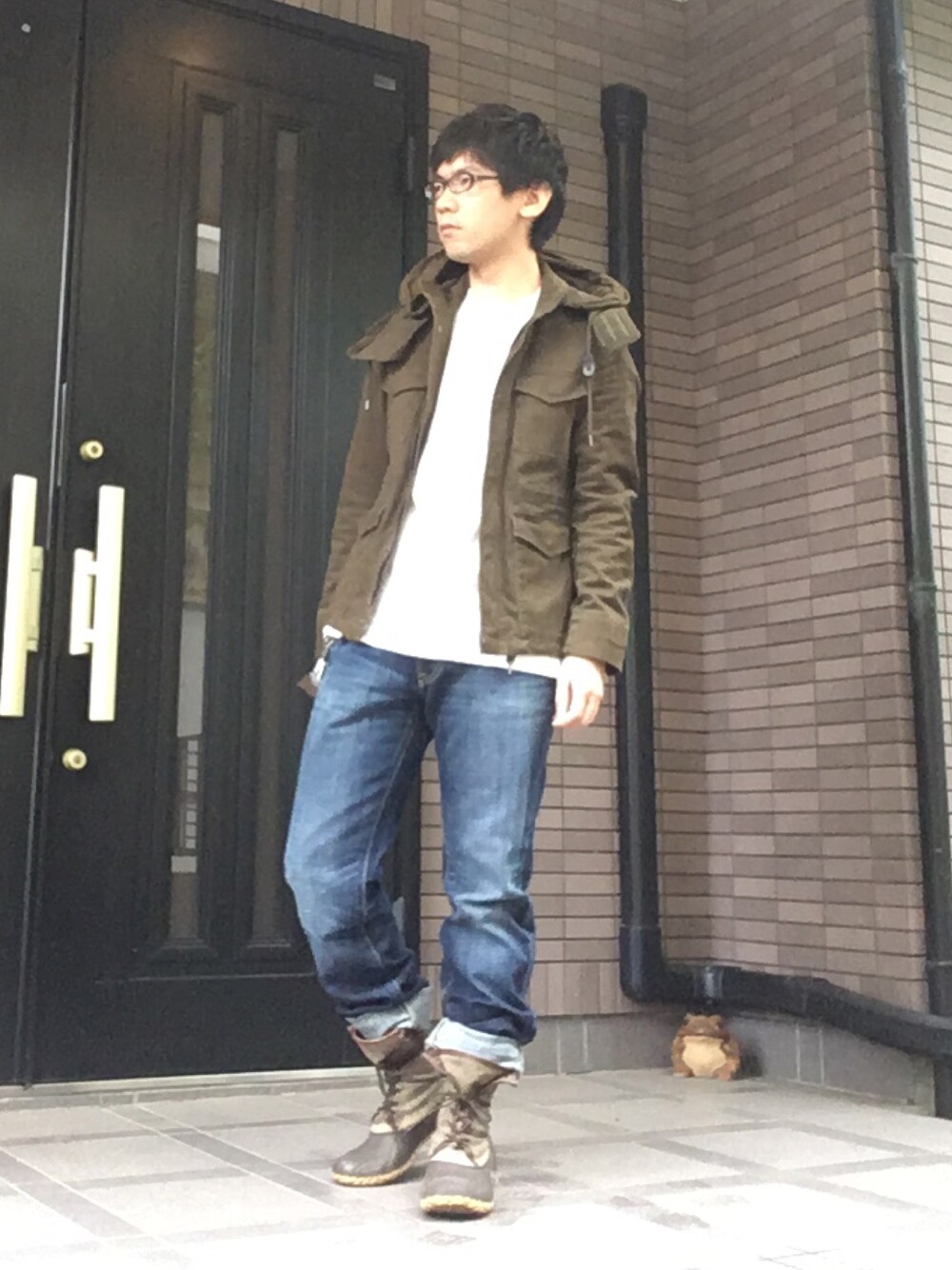 昨日のカッコです。 雨が降ってたのでいつものビーンブーツ、緩めのジーンズで男らしさを上乗せ。 上は、緩めの長袖Tシャツの上から、ちょっとタイトめなミリタリージャケットでメリハリを入れました。 ジャケット来てるとAラインだけど、脱ぐと上下ゆるゆるっていうね。 珍しく上下ともユニクロ使ってます。