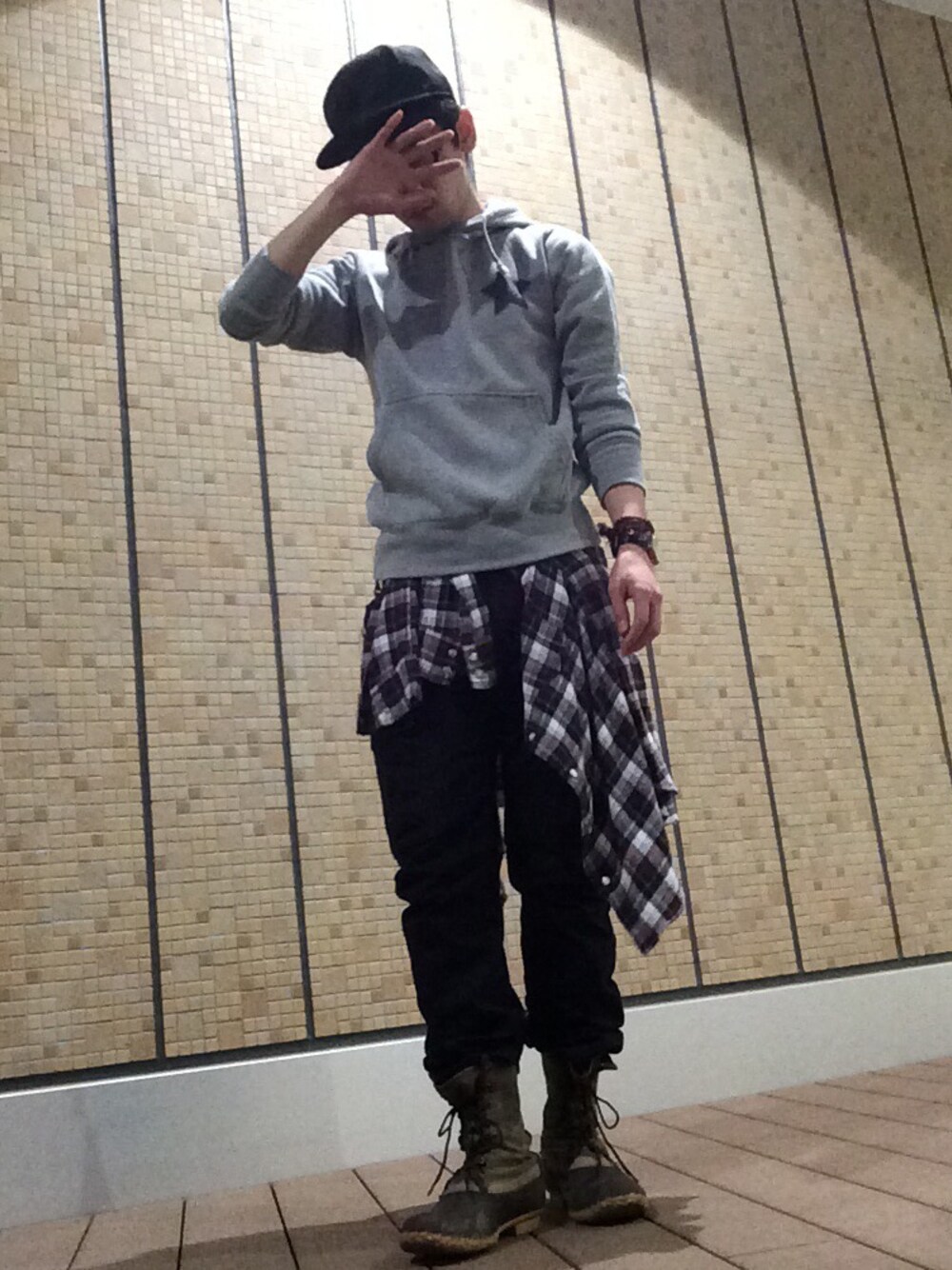 今日は雨だったので、ビーンブーツを使用。 パーカの胸の星形は自分でスプレーしたものです。