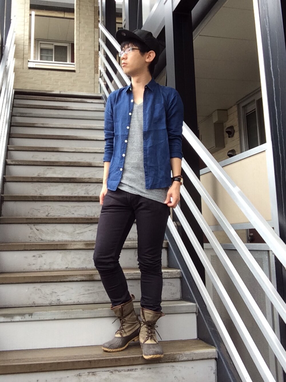 今日はちょっと涼しかったので長袖。 黒スキニー&紺シャツで大人っぽくしつつ、ビーンブーツやキャップでハズし。