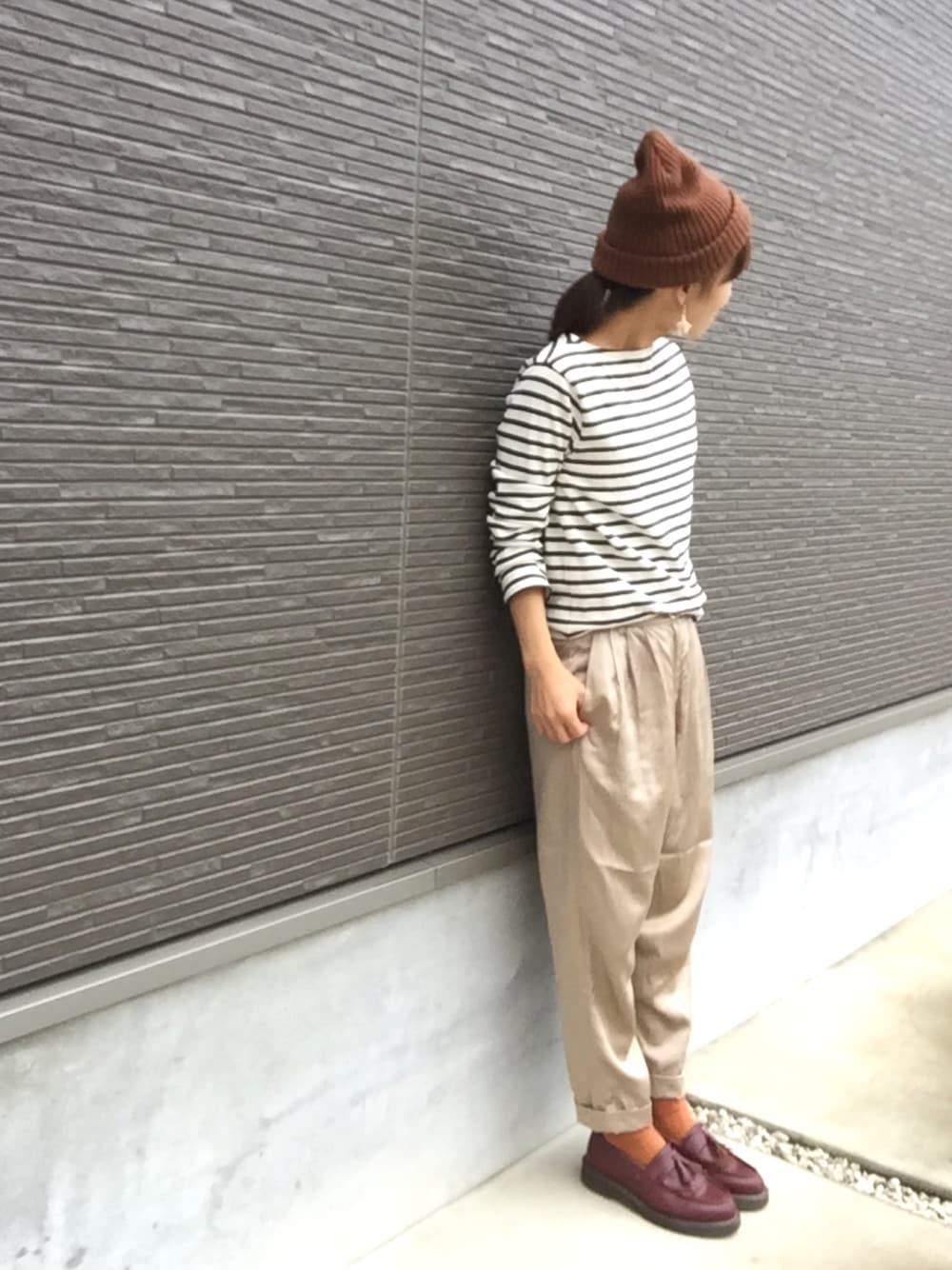 ボーダー×茶色。 定番のベージュパンツは シルクのツヤでアクセントに。