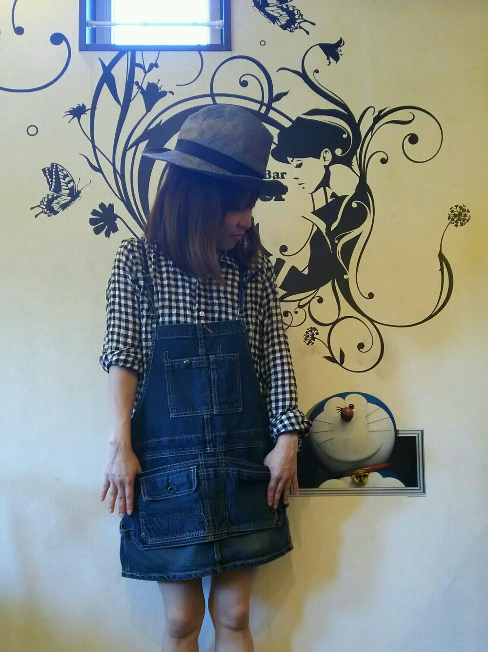 チェックシャツに、サロペット。。 勇気だして、足出しました😅 ハットで、大人仕様に。大人やけども。。 スニーカー、写ってないけど、白のアディダス。。 お散歩したい☺