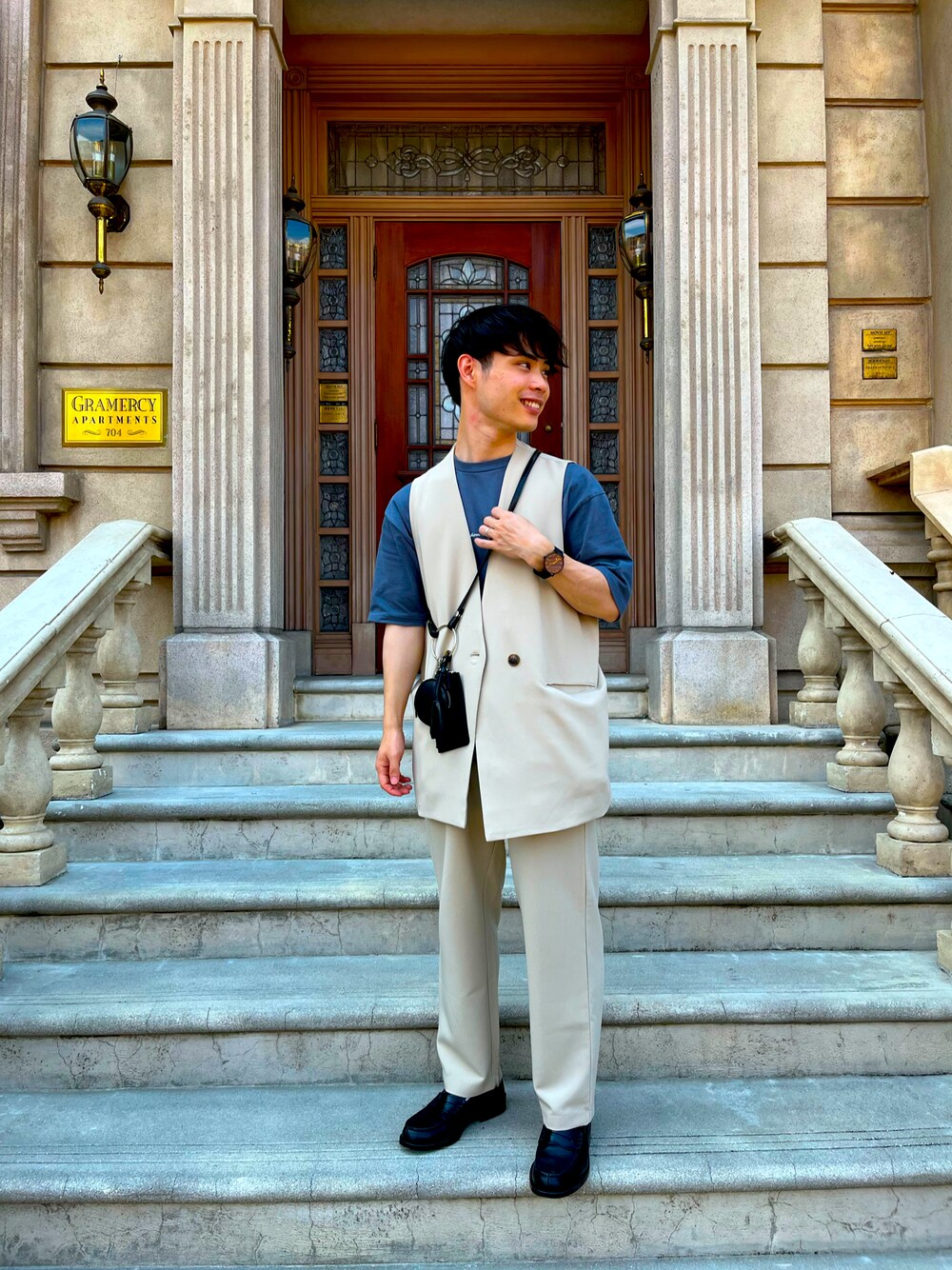 あとHSのベスト「『セットアップ対応』 ダブルテーラードベスト」を使ったコーディネート