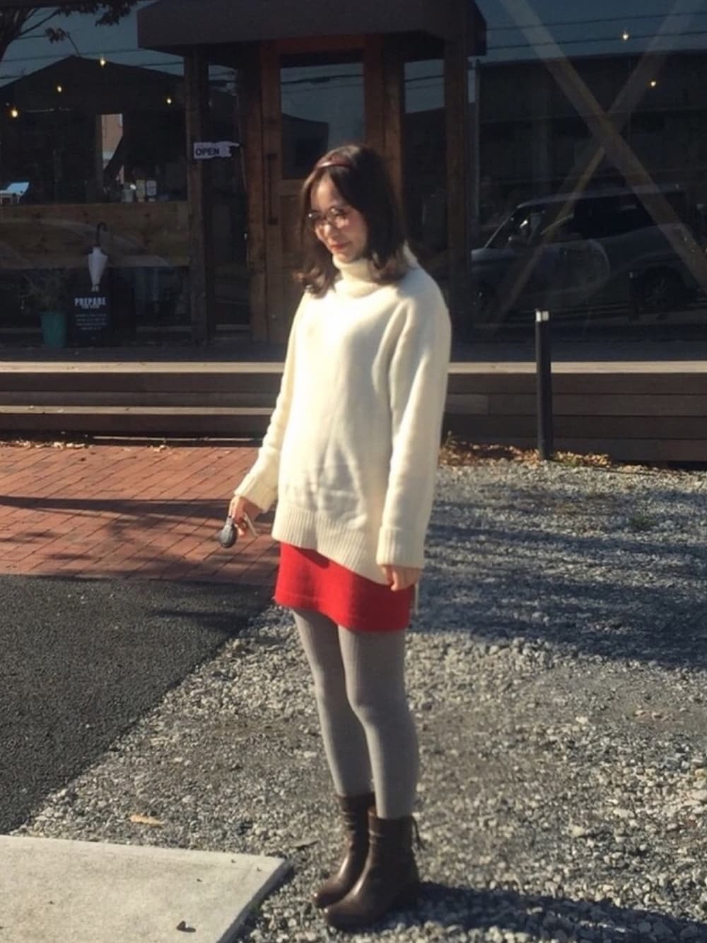 APCのニットのミニスカートは 古着で購入 イタリア製の毛糸なの。UNIQLOのヒートテックのリブタイツ今期すごく重宝しています(*´∇︎`*) 来年はベージュのリブタイツ販売してほし〜っ🙏🏻 ママのショートブーツ借りた♡