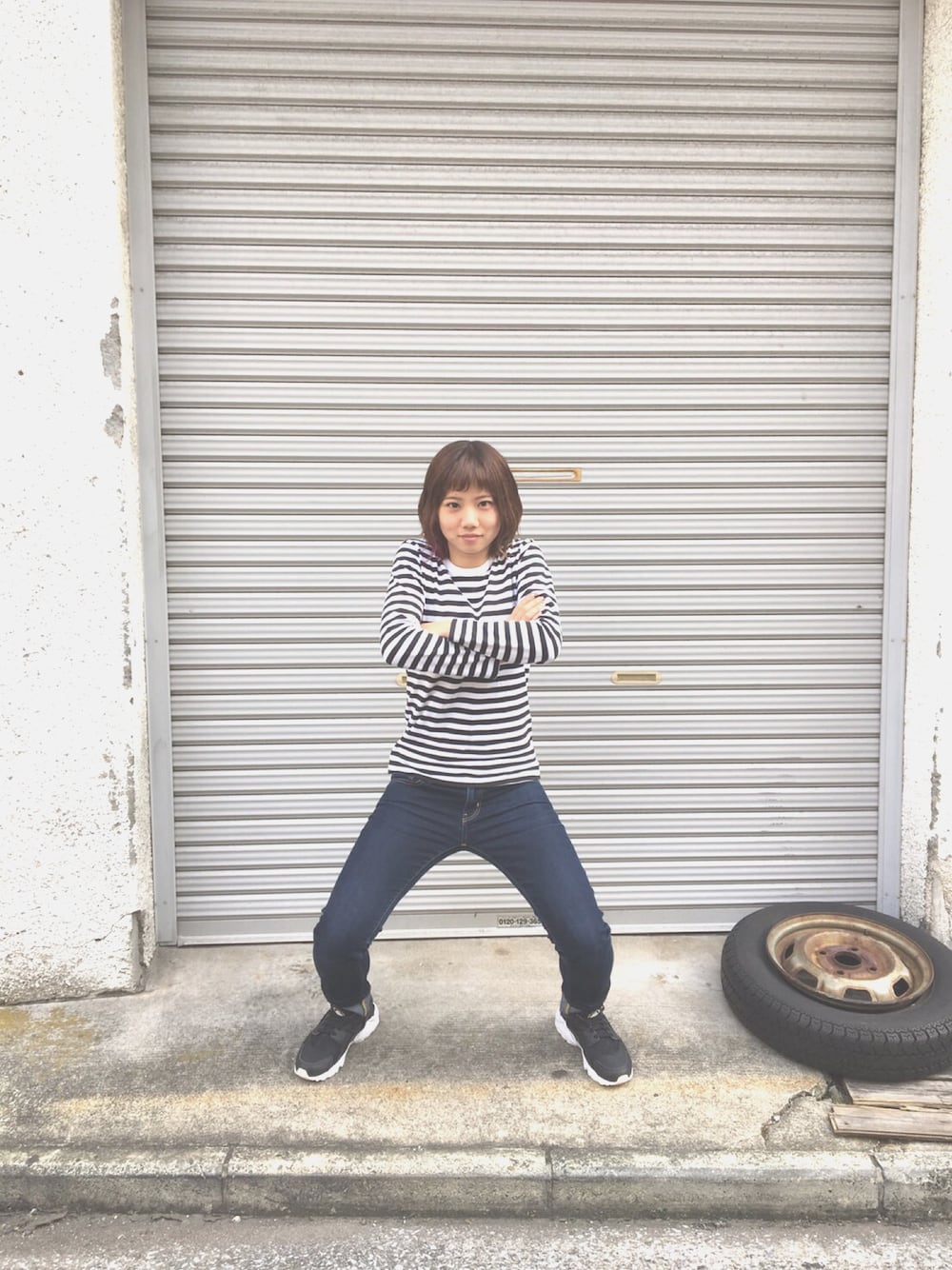 ホワイト系のTシャツ/カットソー、ブルー系のデニムパンツ、ブラック系のスニーカーを着用したレディースの秋コーディネートの1枚目の写真