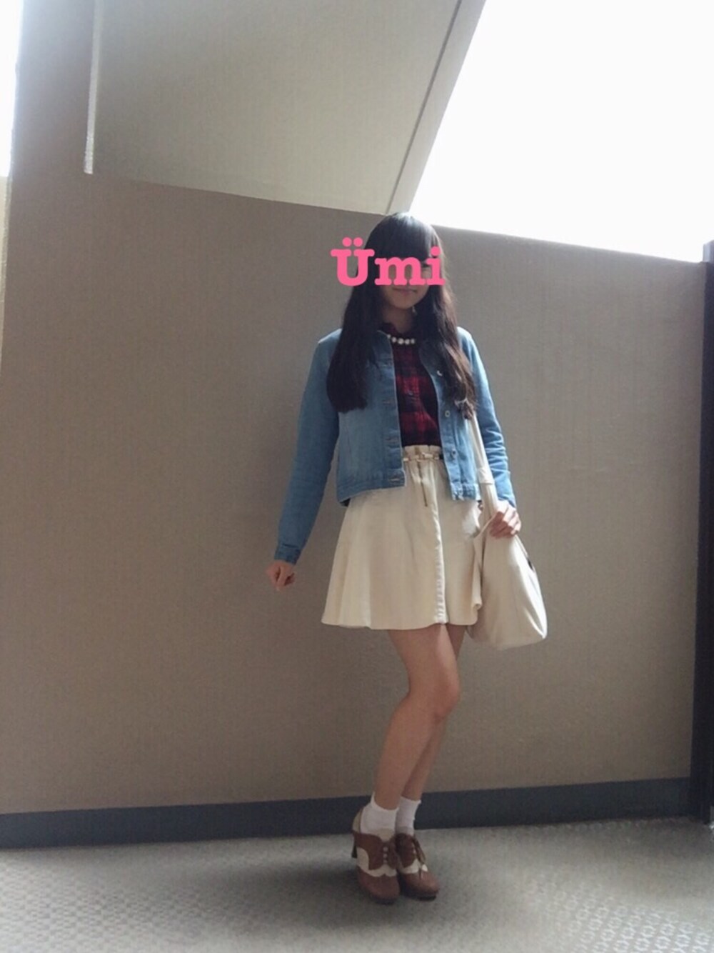 濃いめ赤のチェックシャツ×Gジャンは辛めコーデになるかなと思ったので、白フレアスカートとパールネックレスで女の子らしさを出してみました👧🙌