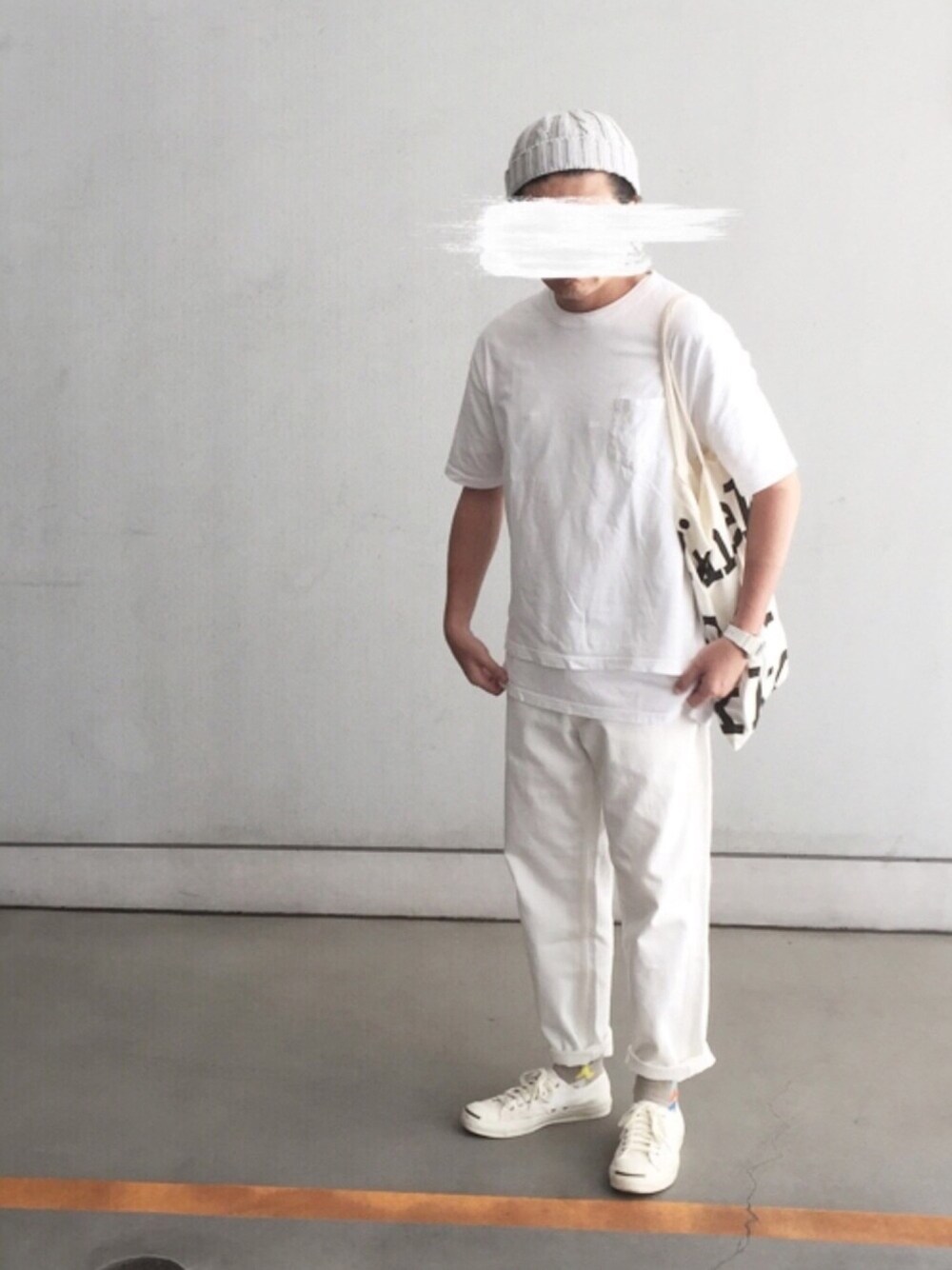 ホワイト系のスニーカーを着用したメンズの夏コーディネートの1枚目の写真