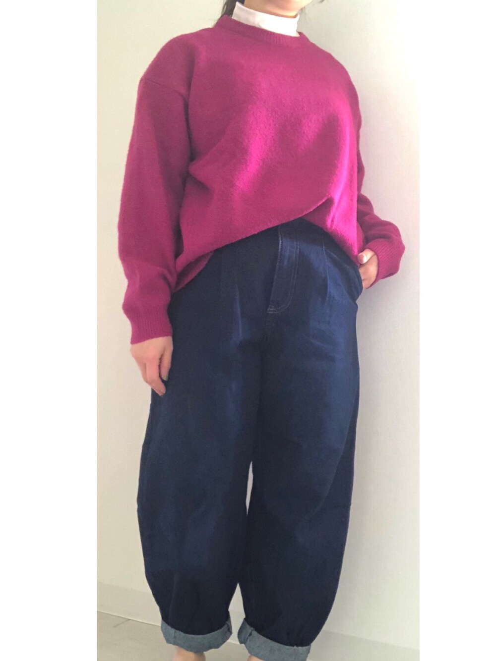 コーデ録。 派手ニットと濃いデニムが好きです。 めちゃベリーピンク! ZARAのスラウチパンツは色と形に一目惚れ。 大きい脚も隠せる。ニッカポッカみたい。