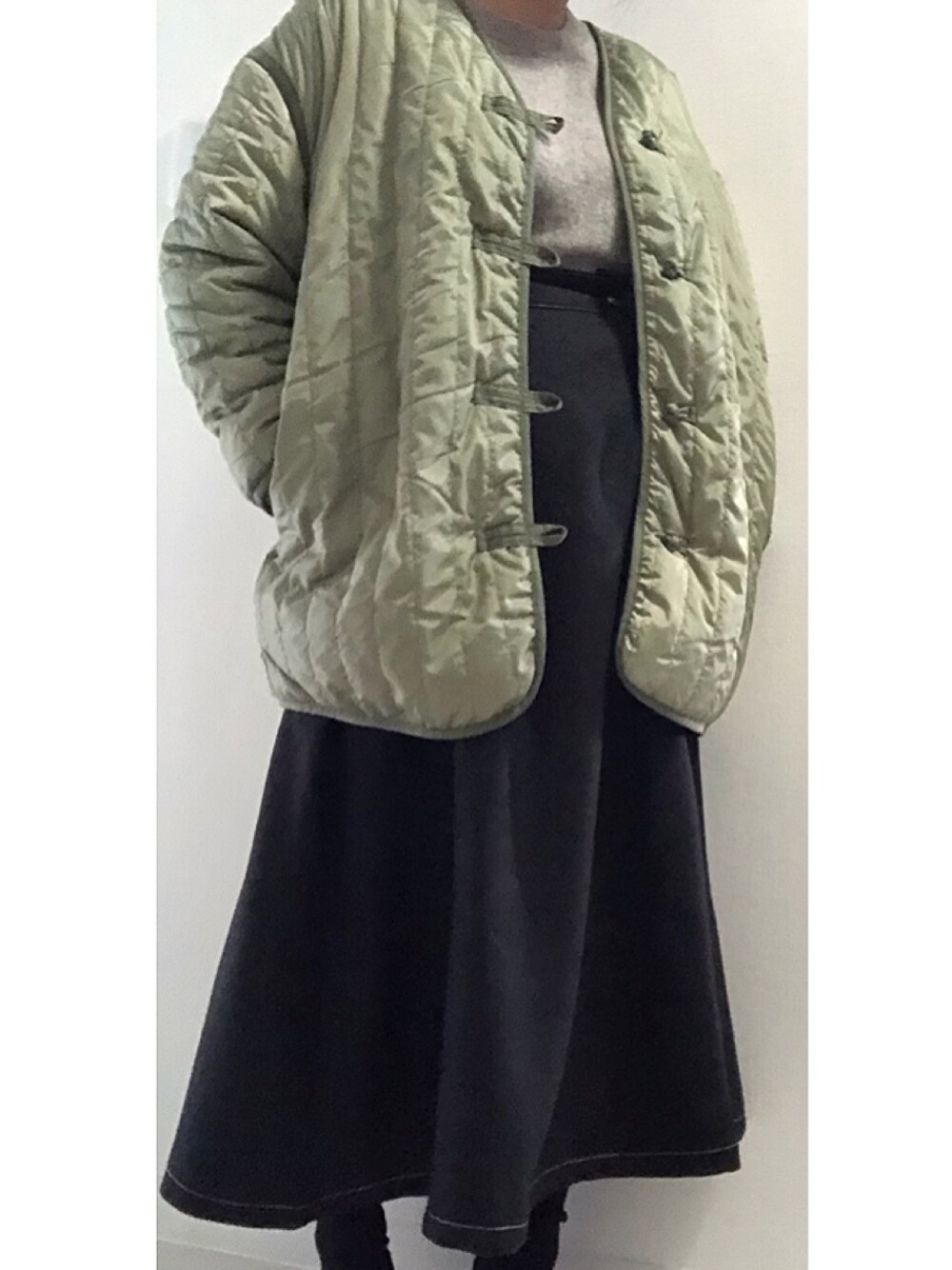 たまにはアウターも。 チャイナボタンに一目惚れした キルティングコート。 色も可愛い! UNIQLOのプレミアムラムセーターは 薄手なのに暖かい。素晴らしい。