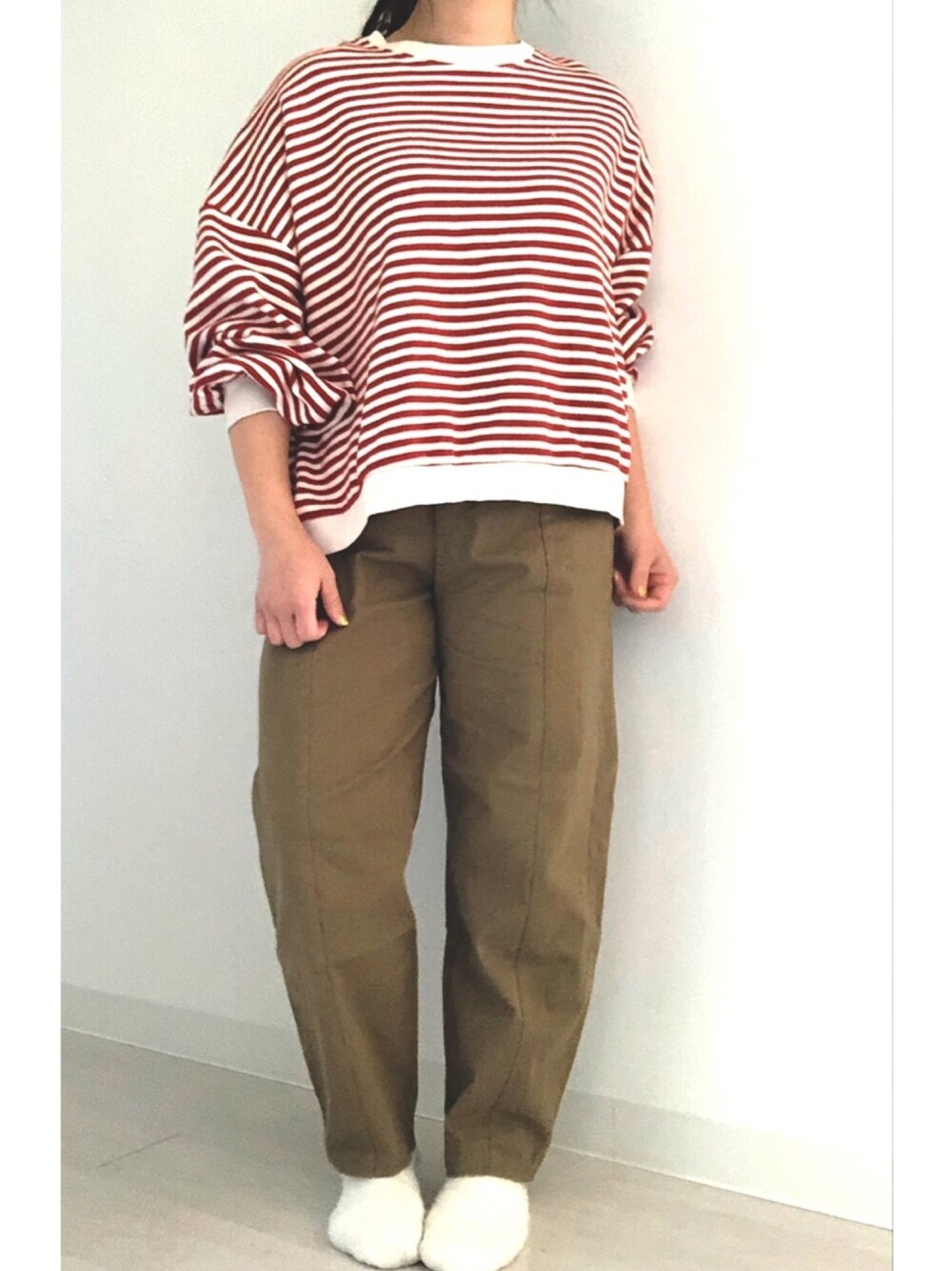 ウォーリーみたいな赤白ボーダー。 でもめっちゃ気に入ってて 何年も着てしまってる。 ZARAのパンツは好きな形のスラウチ。 チノ素材でストレッチ、センタープレスというまさに理想の1本。 しかもこのカーキベージュ系の色がまた使える! 困ったらこれ履いてる気がします。