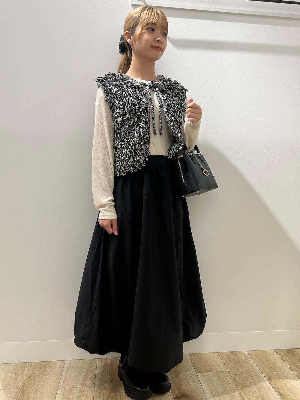 今回は、バルーンスカートをメインにコーデを組んで見ました! バルーンスカートのふんわり感と、KBFのループニットベストの相性バッチリで統一感のあるコーデです! KBFのループニットベストは、2WAYで使用することが出来るので、印象を変えて着回すことができます!! バルーンスカートはどの年代でも使いやすいスカートなのでとてもオススメです◎ ぜひ参考までに、!
