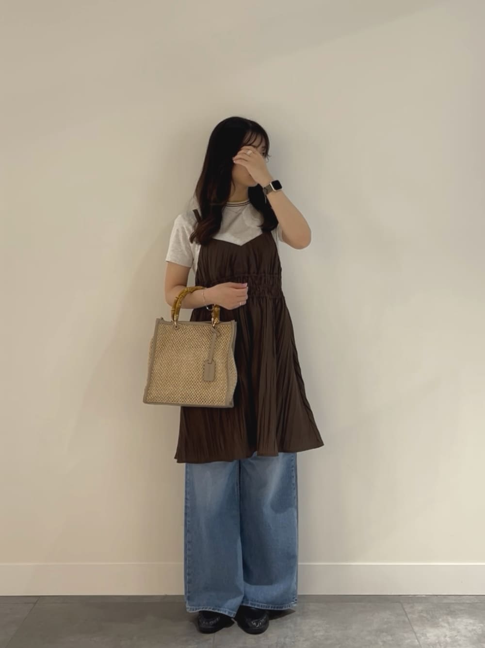 ご覧いただきありがとうございます♪ KBFのミニキャミワンピースにあえてワイドストレートなデニムを合わせました。 キャミワンピースは、夏はワンピースサラッと、冬はレイヤードコーデとして、上からスウェットを着たりと着回しできるのでオススメです◎ ジムフレックスのTシャツのクルーネックの部分もポイントになっています! ご参考になれば嬉しいです💫