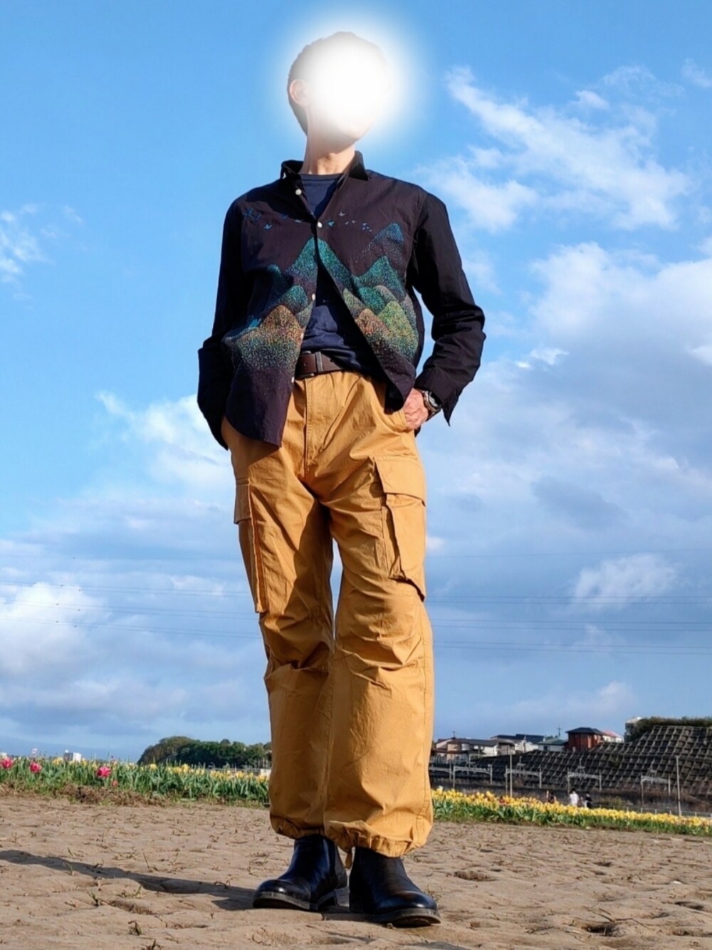 上下でコントラストをつけてみました。シャツの柄で色を拾うと、案外まとまりました。