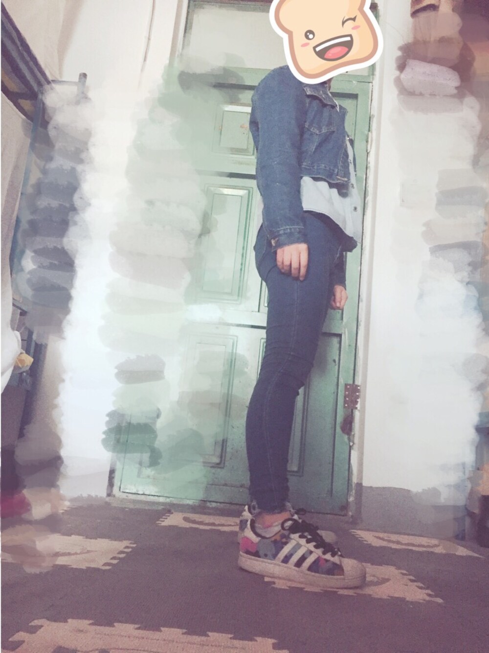 ブルー系のスニーカーを着用したレディースの春コーディネートの1枚目の写真