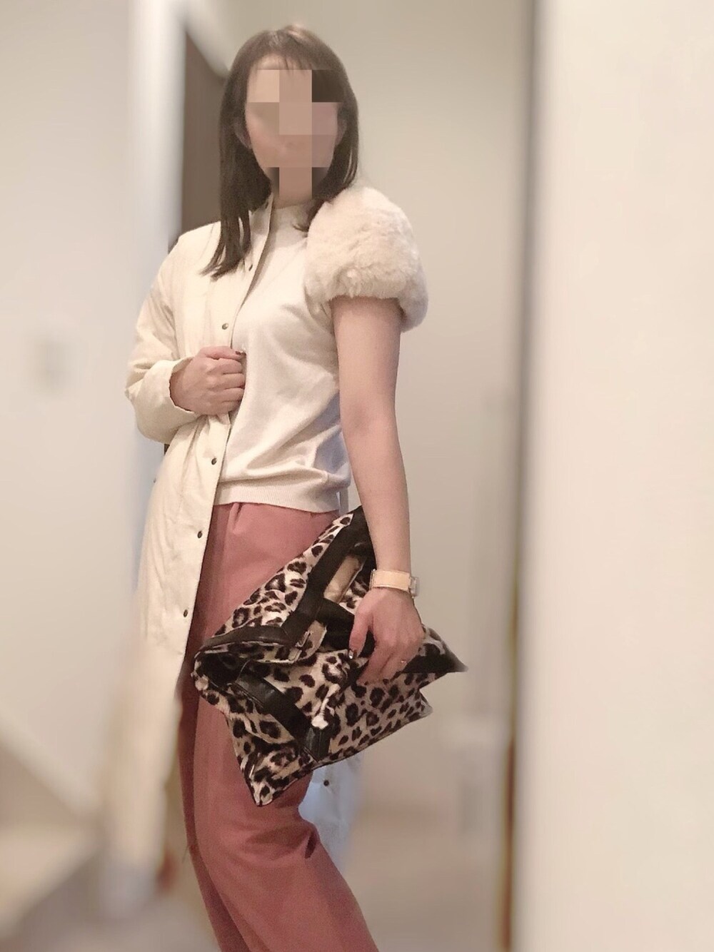 暖かい今日は着たかったファー半袖ニット🐏 この甘いファーの袖かわいい🤍 ピンク✖️白だけど、甘すぎない美脚パンツで☺︎ アニマル柄のバッグをクラッチ風にしてます! ご覧いただきありがとうございます😊