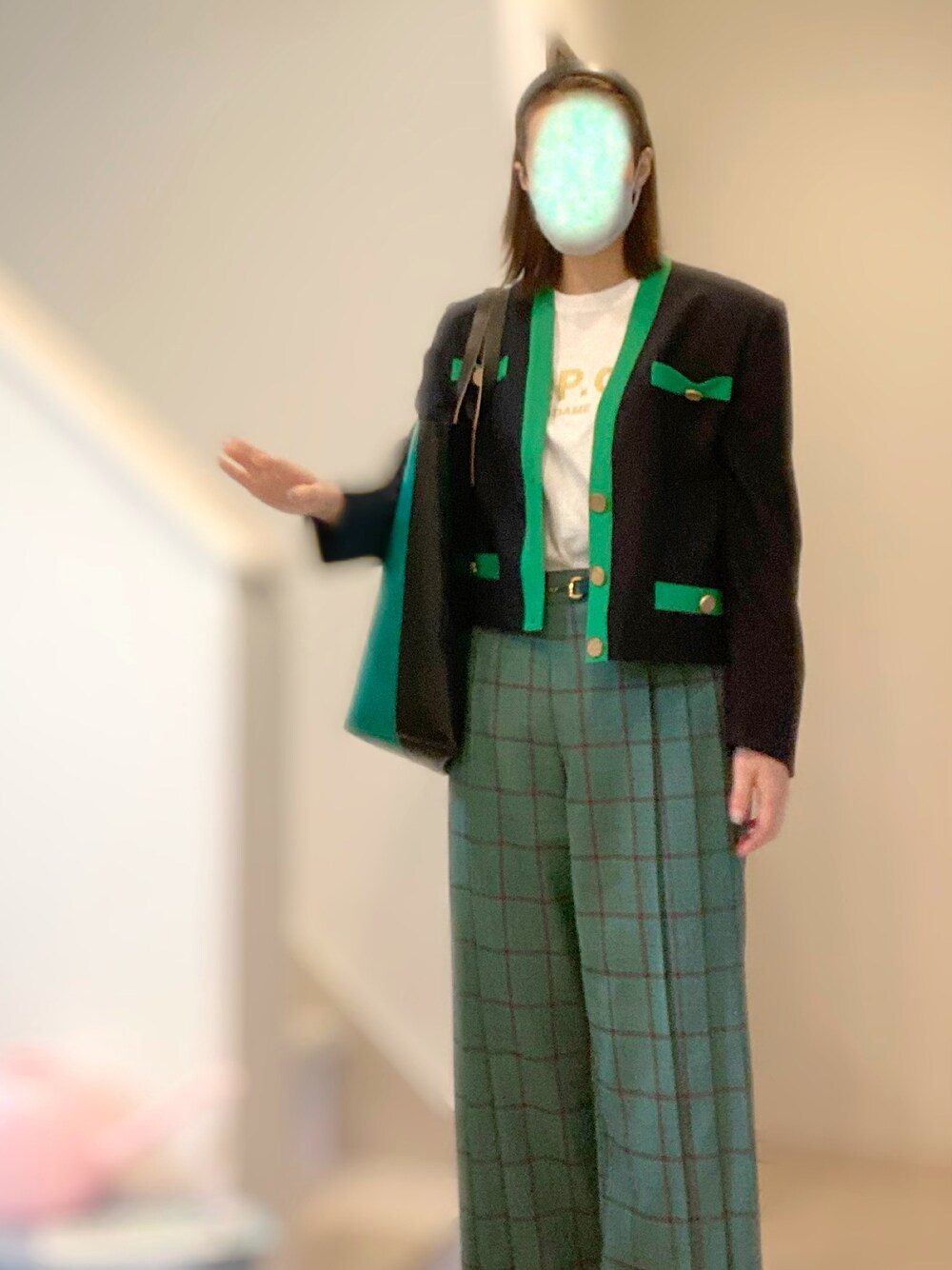 ちょっと投稿が雑いですが💦 グリーン🍀をポイントにしたコーデ💙💚 バイカラーのカーデ?ジャケット?はおしゃれ感アップ✨