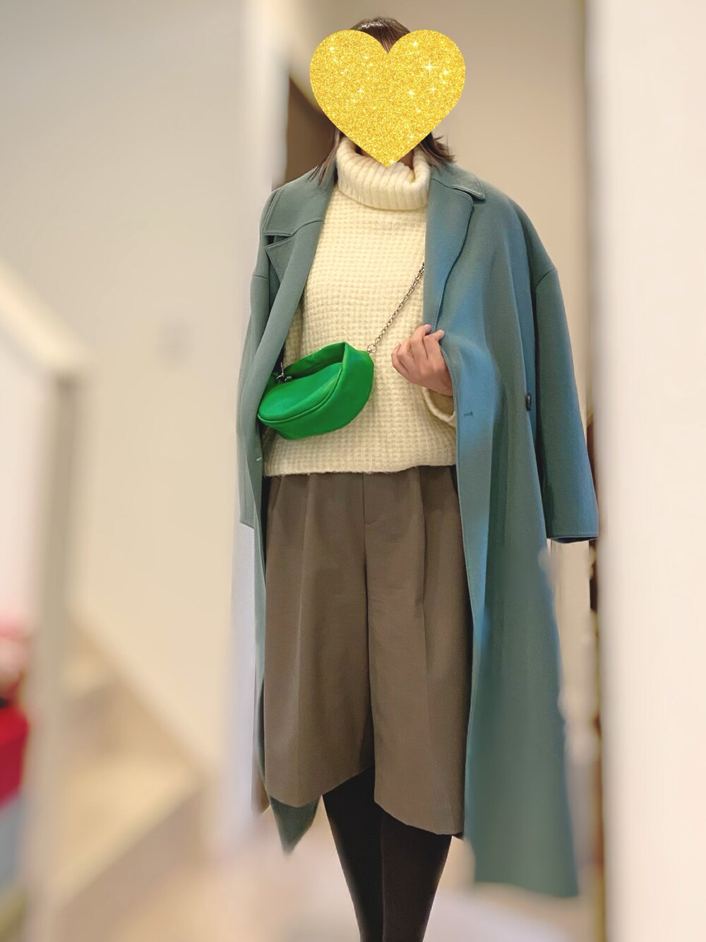 グリーンバッグ👜がポイント💚 コートを見ても、グリーン大好きっ子🍀 グリーンカレーも好き🍛