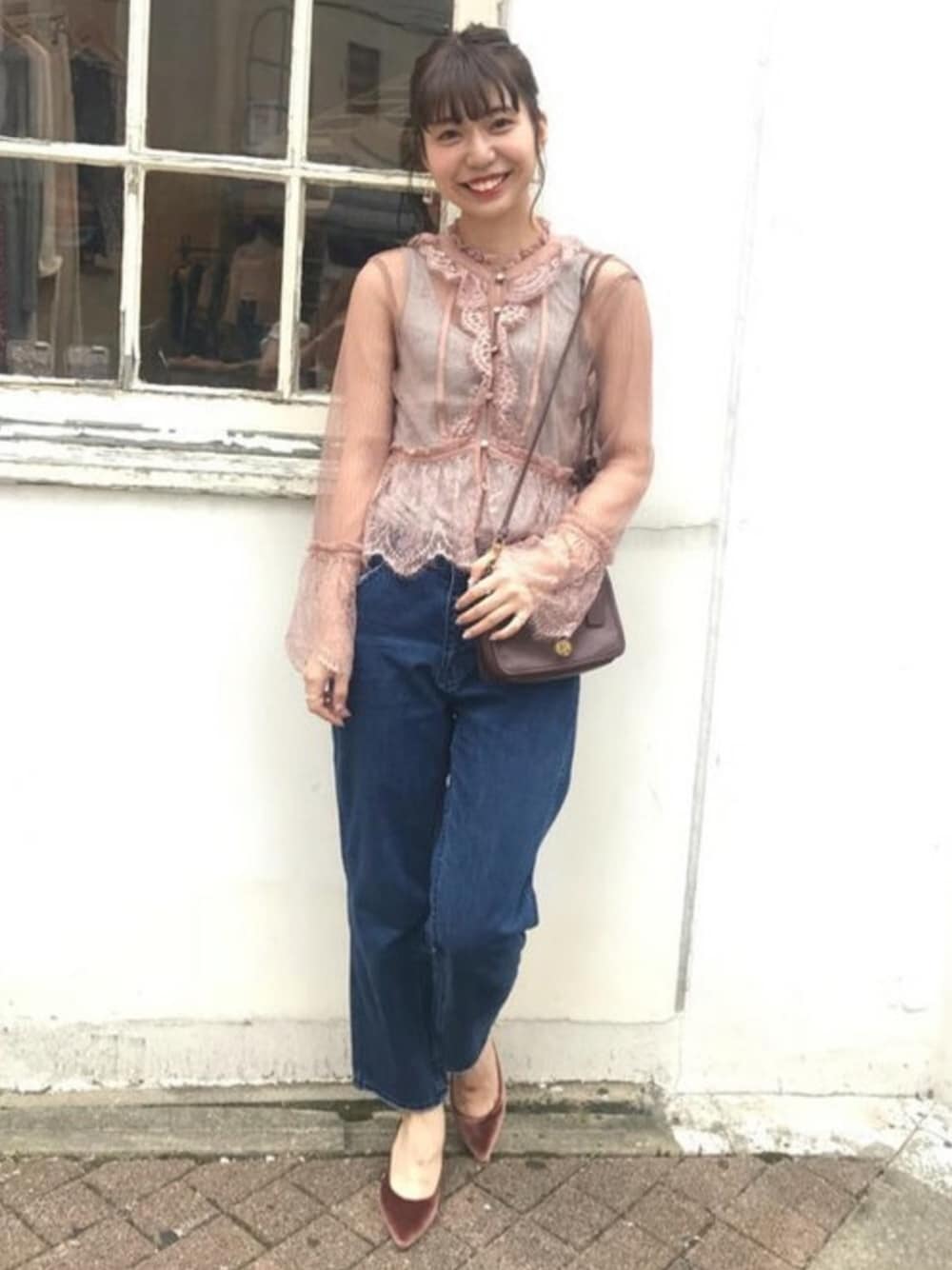 女性らしいレースのブラウスは、甘くなりすぎないように太めのデニムとコーディネート♡ ドレッシーなアイテムは、カジュアルテイストのアイテムとの相性◎ flower名古屋店 inukai