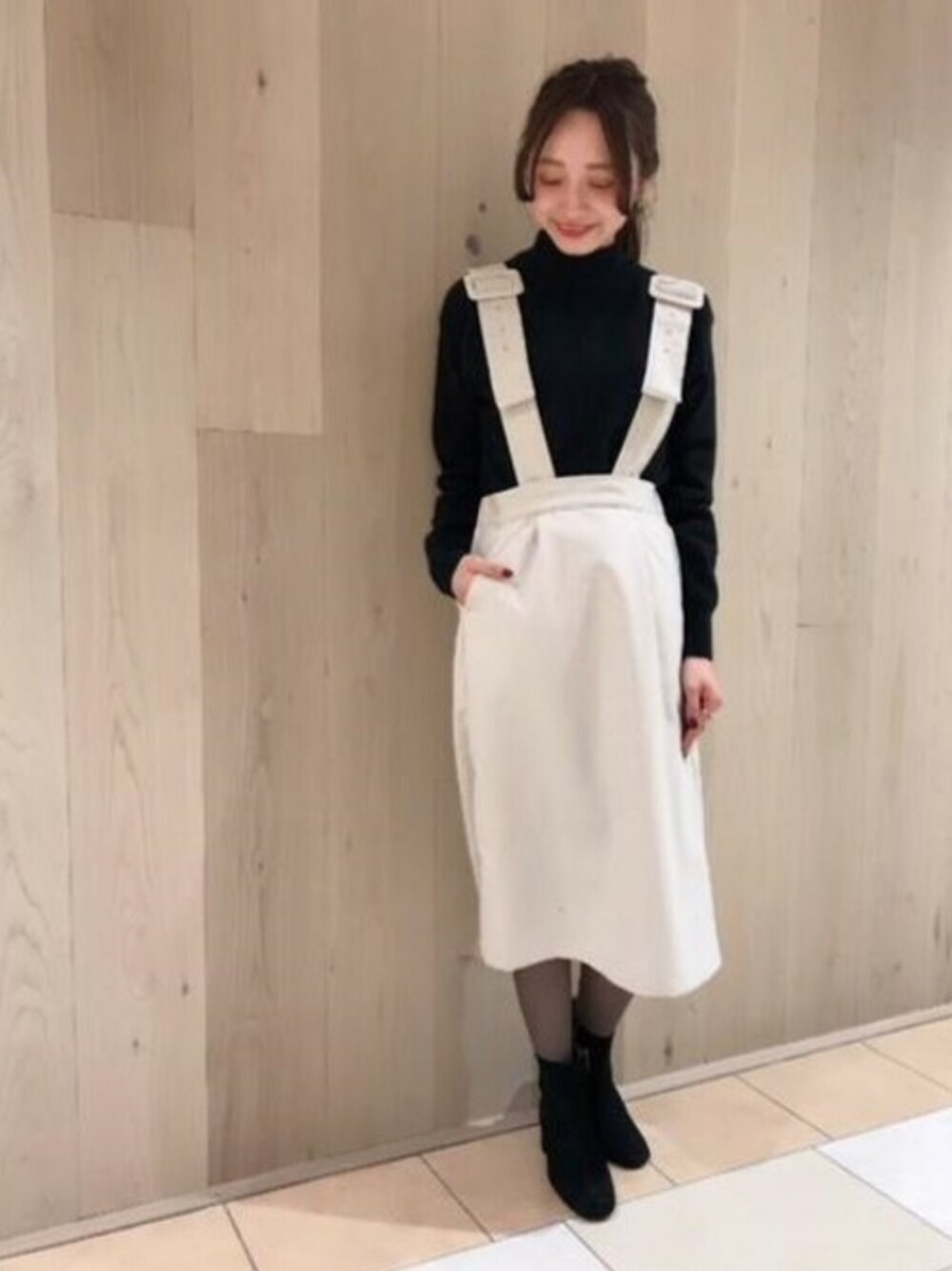 温かみのあるヘリンボーンの生地を使用した大人っぽいサロペットスカート★ インナーとblackにする事でより落ち着いた雰囲気に・・♪♪ サロペットは肩ひもを取り外せば、シルエットのきれいなスカートとしても着れる着回し抜群アイテムです! flower池袋店 emoto