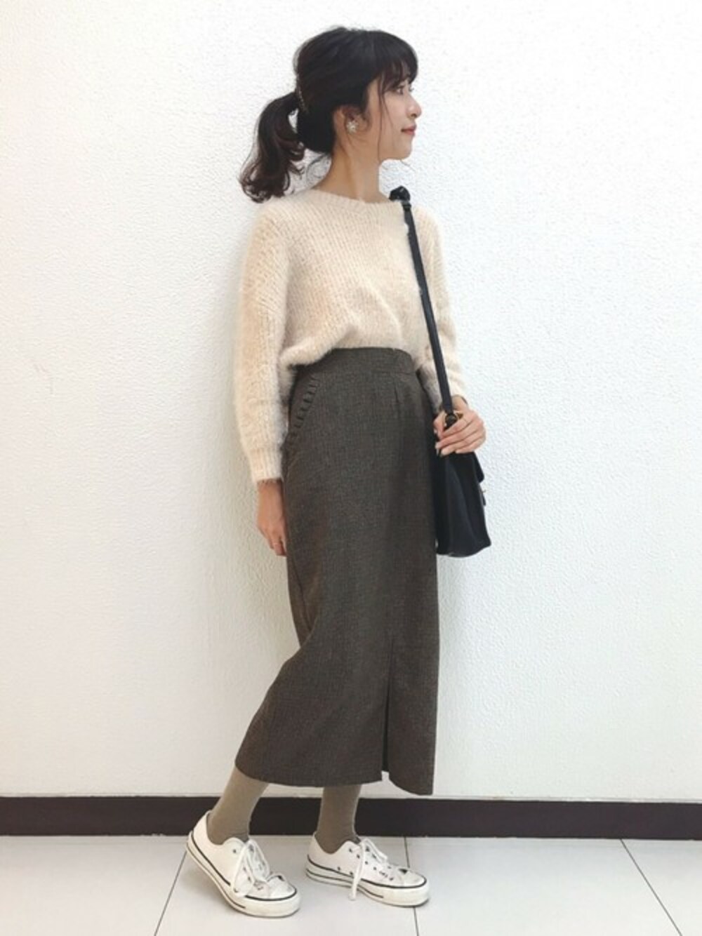 もけもけの肌触りと、コンパクトなサイズ感が可愛い秋冬ニット♪ 程よい丈感なので、フロントだけ少しインしたスタイルが可愛い1着★ 細かなチェック柄が可愛いタイトスカートを合わせれば、オフィスでも活躍できる万能アイテムです! flower横浜店 iizasa instagram→@flower_iizasa