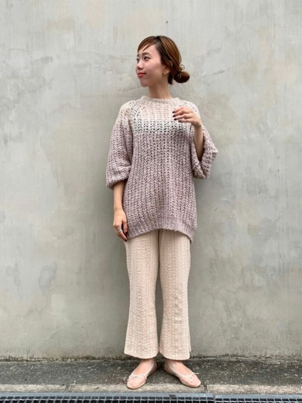 素肌がさりげなく透ける、透かし編みのニット♡ 柔らかな色合いが女性らしさを引き立ててくれるグラデーションが可愛い♪ レース生地のパンツで、リラックス感のあるコーディネートに♡ flower堀江店 tanaka instagram→@flower_horie