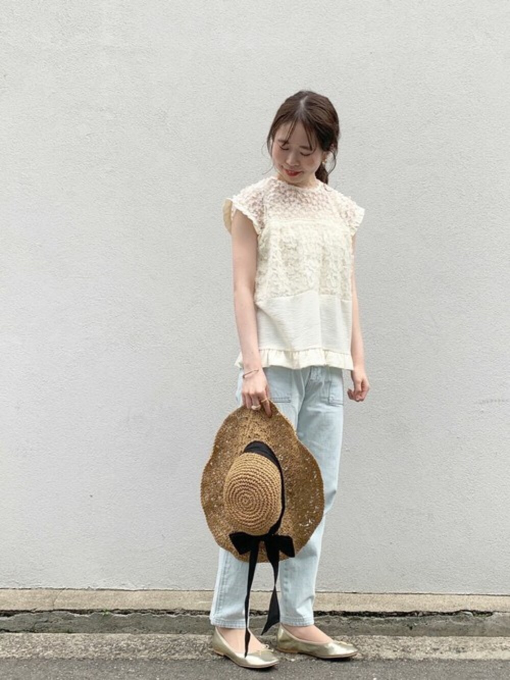 華やかなデザインが目を引くflowerらしさ溢れる デザインブラウスを主役にコーディネート♡ デニムでさらりと合わせるのが大人可愛いポイントです✩ 足元はバレエシューズでフェミニンに。 堀江店 yasuda instagram→@flower_yasuda