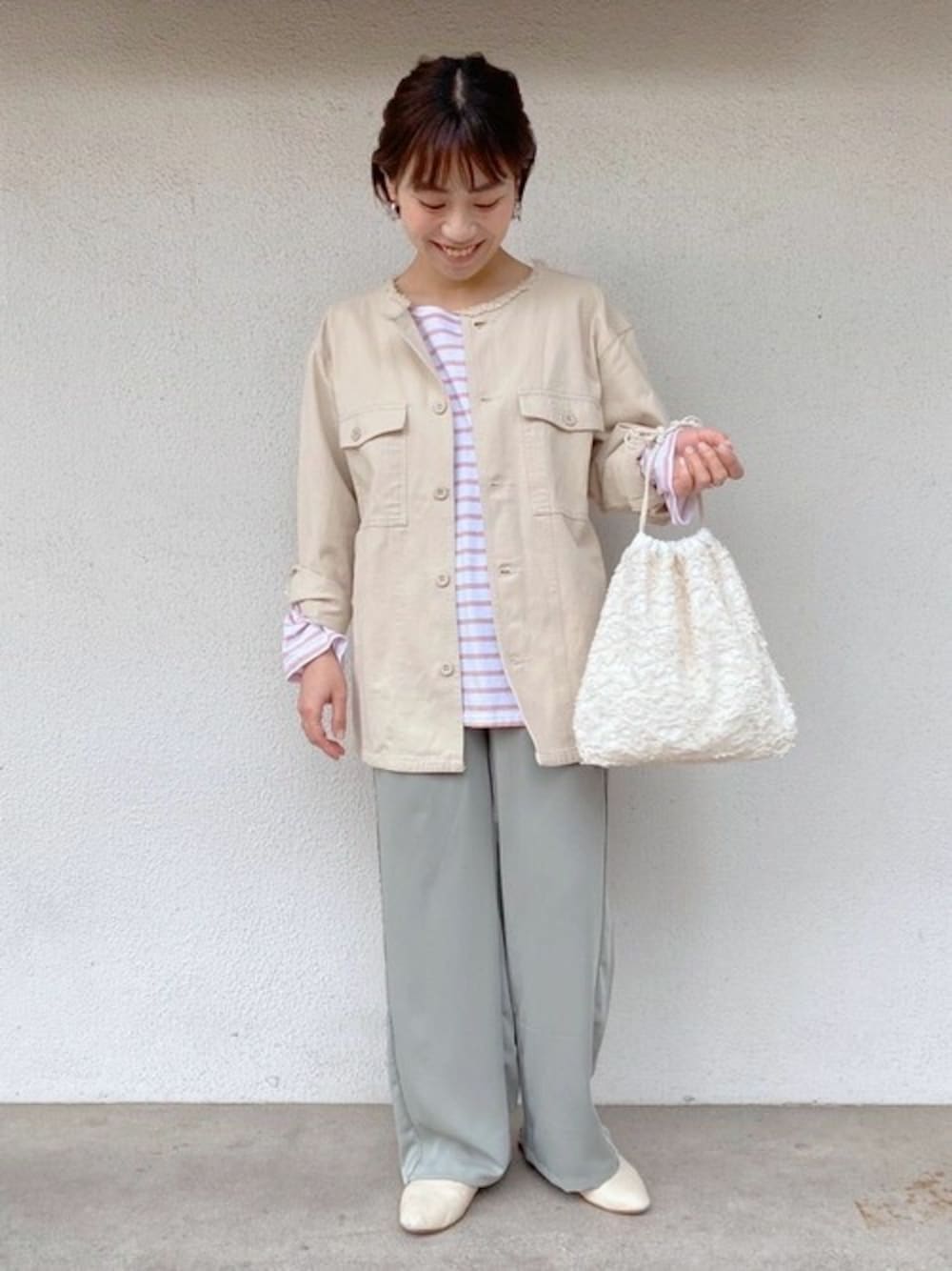 首元がすっきり見えるノーカラージャケット♡ カジュアルなアイテムには、春らしいピンクのボーダーをイン! 全体的に淡いトーンでコーディネートしました♪ 横浜店 tomita instagram→@flower_tomita