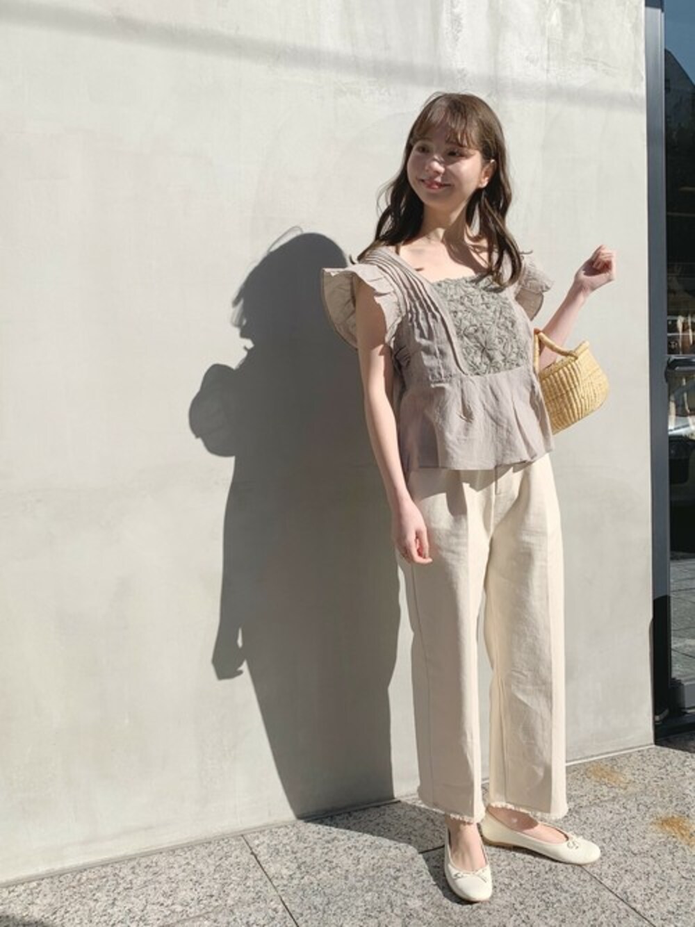 ガーリースタイルにぴったりなブラウス♡ 肩にかかる大きなフリルと、胸元に入った花柄レースとの異素材の組み合わせが大人可愛い! 爽やかなアイボリーのボトムスを合わせました✩ PRESS yagi instagram→@flower_yagi