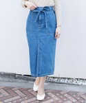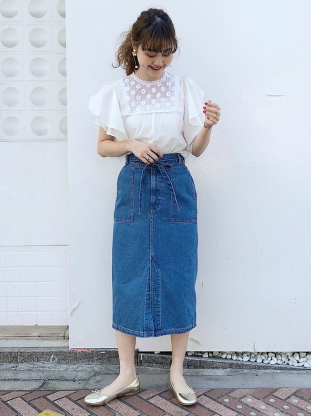 シルエットが綺麗なデニムタイトスカート♡ タイトすぎず、履き心地も◎ ウエストのリボンが目立つように、ブラウスはインしたスタイルがおすすめ♪ 横浜店 arase instagram→@flower_arase