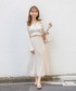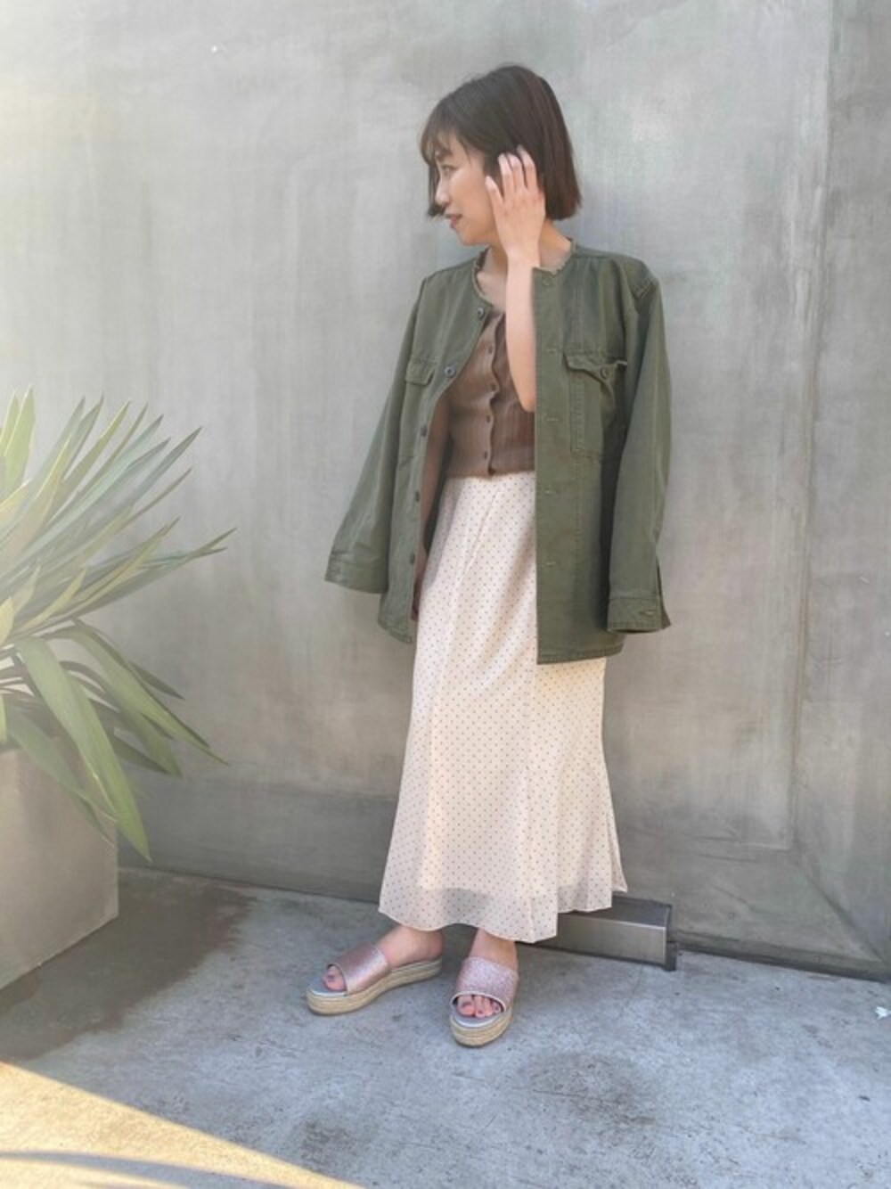 ドットスカートをブラウンのシンプルなトップスと合わせて。朝晩の肌寒い羽織にミリタリーのジャケットを!