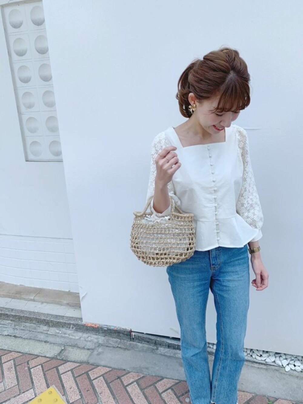 レースの袖がかわいいトップスとフレアデニムを合わせて。髪の毛をアップでまとめることで、スッキリ大人な印象に!
