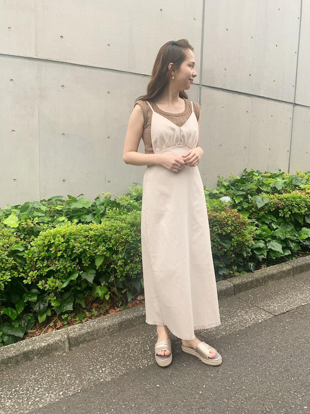 夏らしくワンピース1枚でヘルシーな印象に。ラメ感のあるサンダルがポイントです!