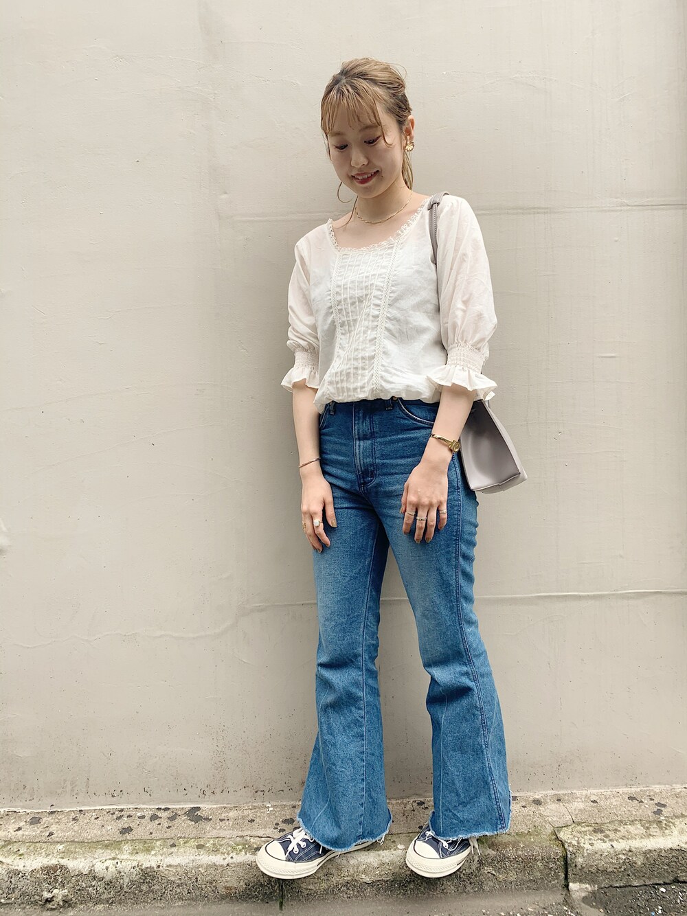 ガーリーなブラウスに、usedのフレアデニムとスニーカーを合わせて、ガーリーになりすぎないコーディネート。 レース使いがかわいい、夏にビーチサンダルと合わせてもかわいいスタイル。 バッグは、あえて小さめなレザーで、カジュアルになりすぎないように少し大人っぽく! 新宿店 takushima instagram→@flower_takushima