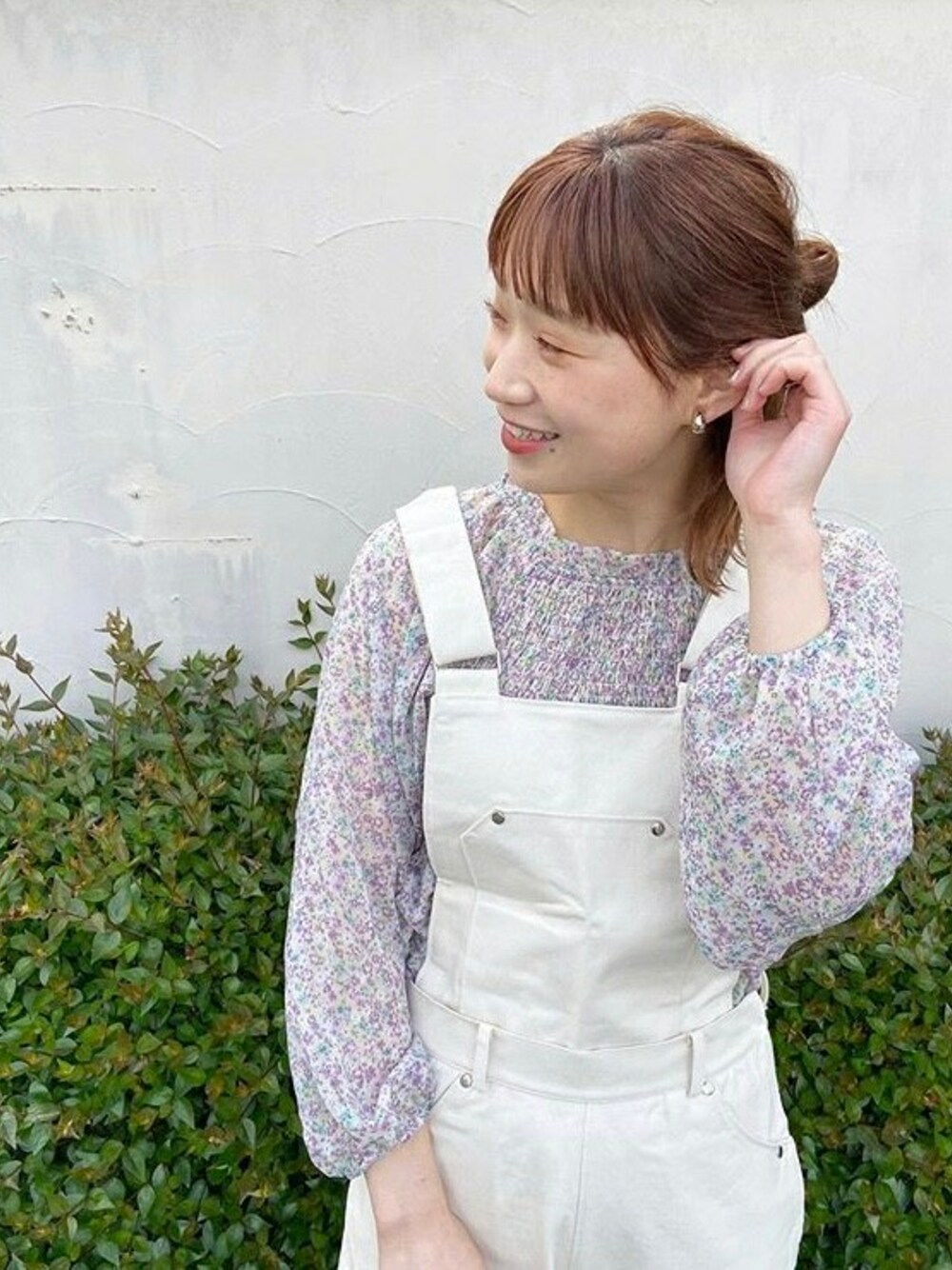 透け感のあるシャーリングのブラウス。 胸元のシャーリングのデザインがスッキリしているので、サロペットとの相性がGOOD! ホワイトのサロペットを合わせることで、子供っぽくならないのも嬉しい。 ゴールドのアクセサリーでより女性らしく。