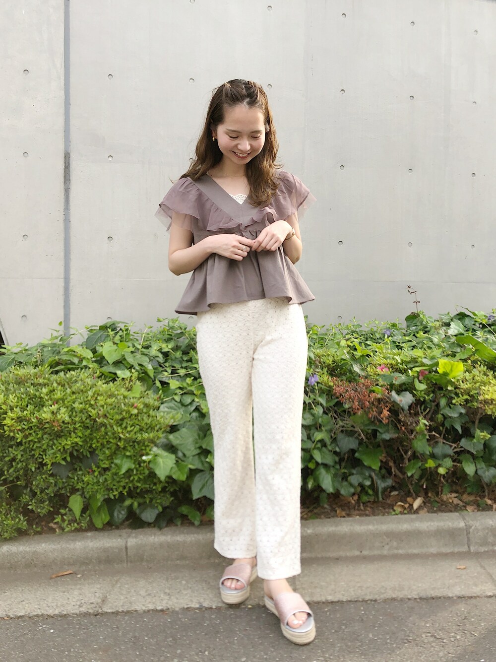 レースの袖が二の腕をカバーしてくれるトップス。 夏に涼しくスタイルアップで着れるので、おすすめです! レースパンツも裏地がついて透けないのが嬉しい! 大人かわいいコーディネート♡ PRESS Yagi instagram→@flower_yagi