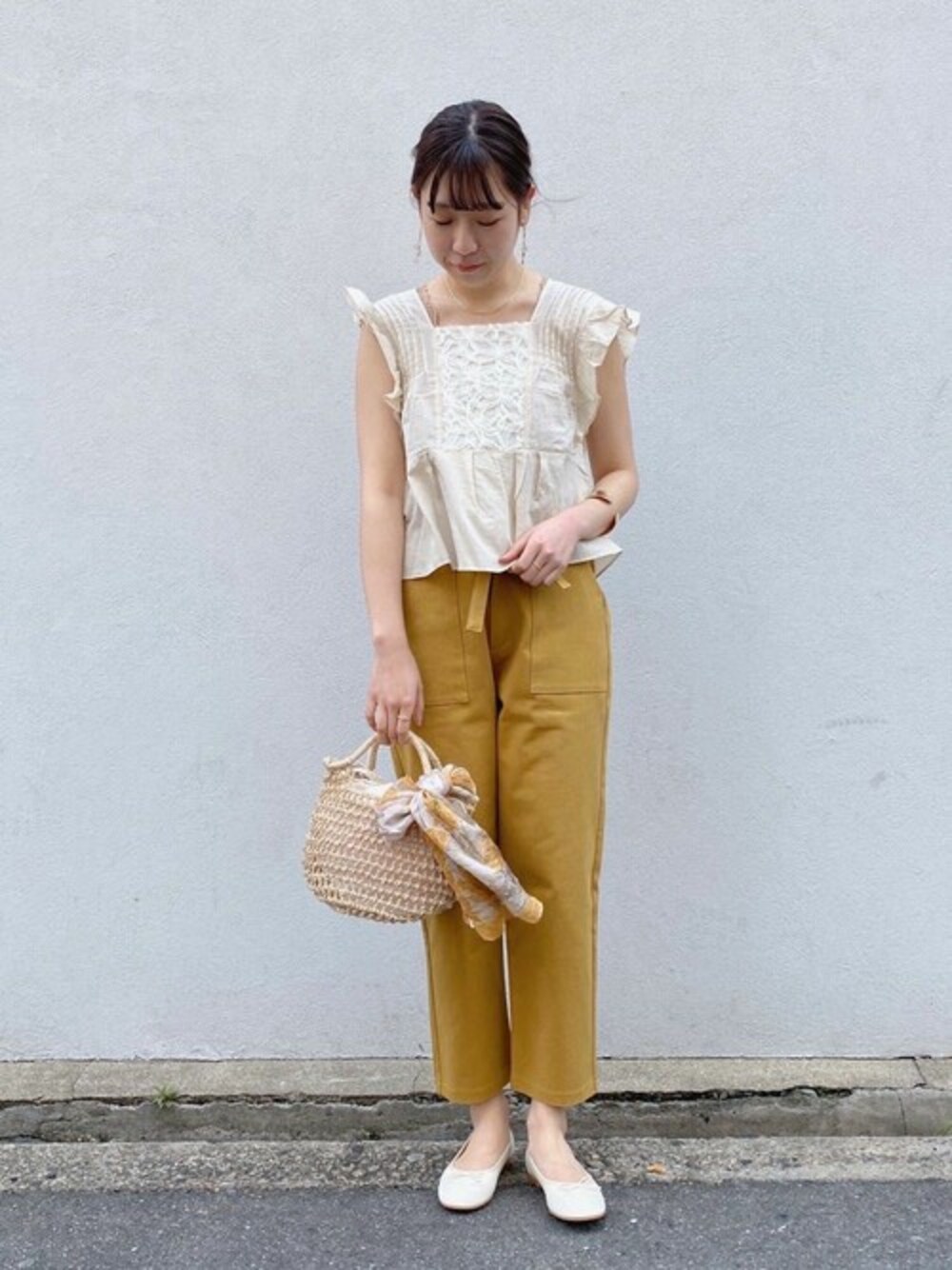 フリルブラウスを、イエローパンツで合わせた 夏にぴったりのコーディネート♡ ヘルシーな肌見せスタイルには、小物で差を付けて★ 堀江店 yuasa instagram→flower_horie