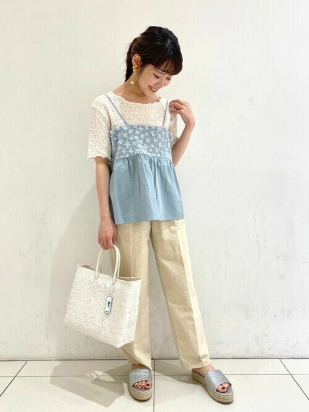 ライトブルーの爽やかなキャミソールに素材感のかわいいインナーにも使えるトップスを合わせて! 夏らしいスタイリングカラーで、これからの季節にぴったりのスタイリング♡ flower lucua店 Masuyama instagram→@flower_lucua