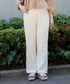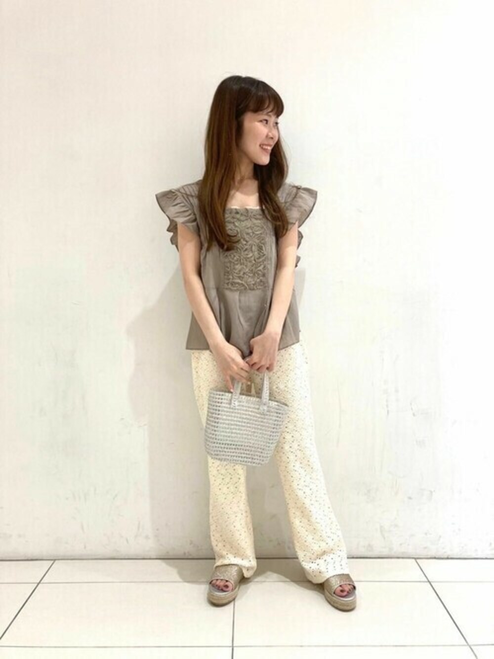ゆったりと履けるレースパンツでリラックス感のあるコーディネートに。透け感のあるバッグがポイント!